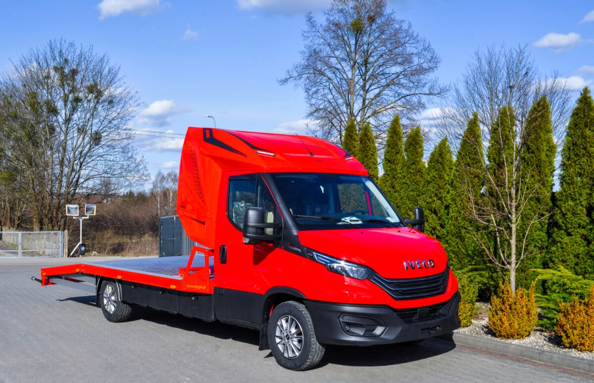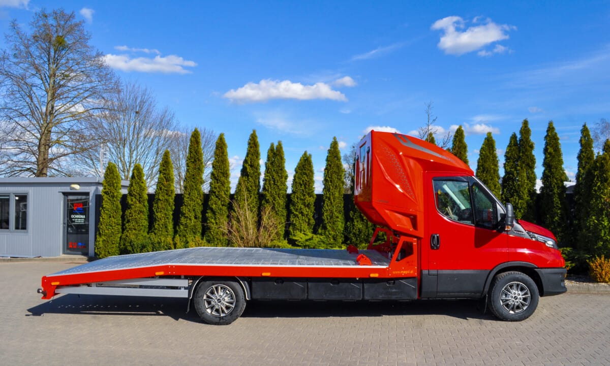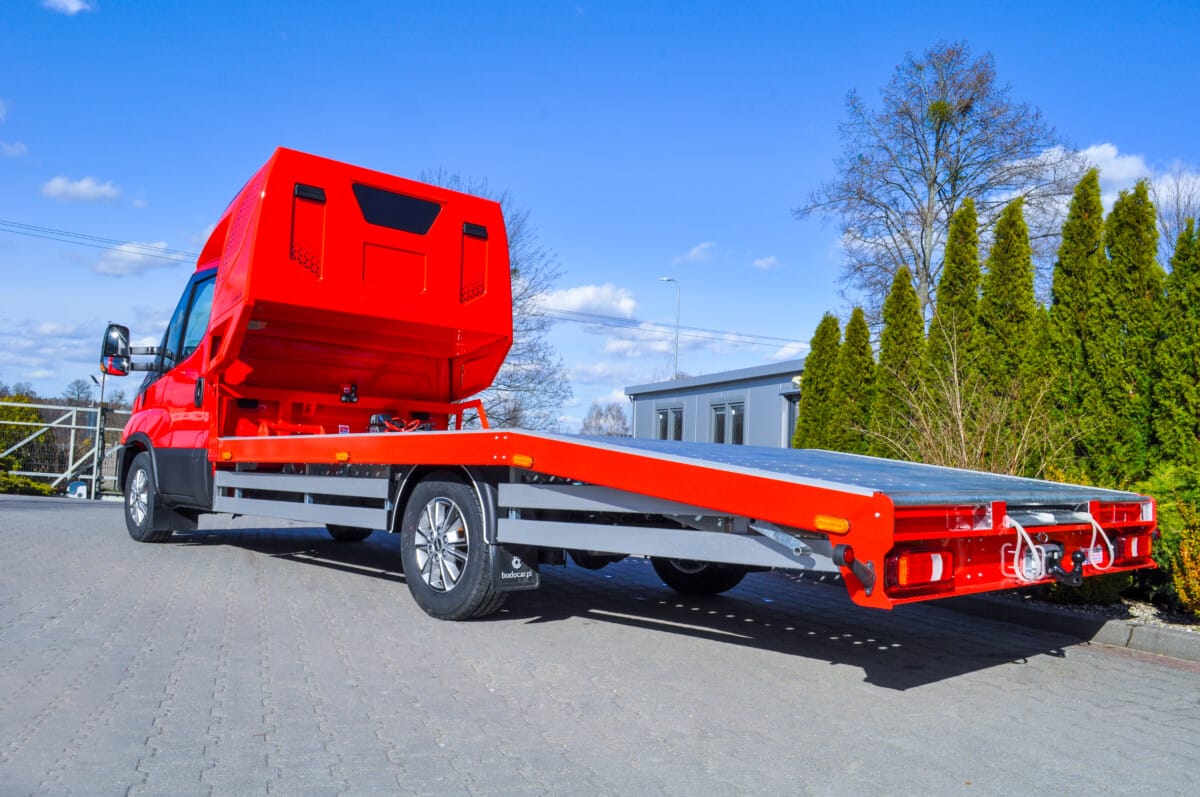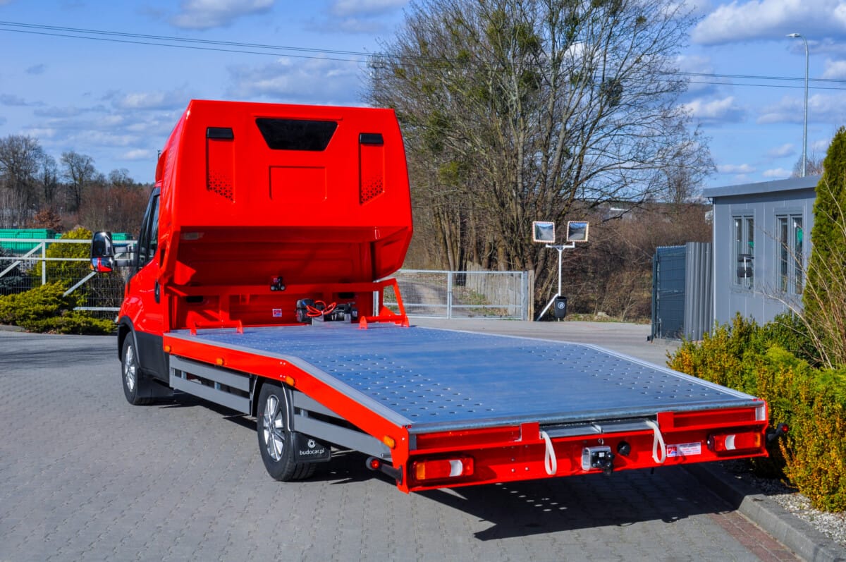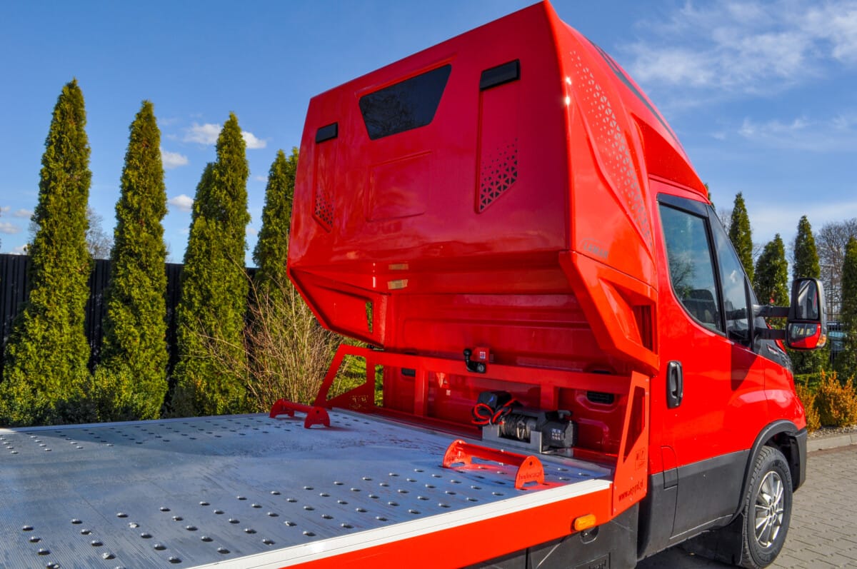 Czerwone Iveco Daily już niedługo trafi do swojego nowego właściciela. Transport aut z takim sprzętem do czysta przyjemność ale też ogromna wygoda. Wszystko za sprawą kabiny sypialnej firmy Lamar oraz wysokiej jakości aluminiowemu najazdowi wraz z kompletnym wyposażeniem.
