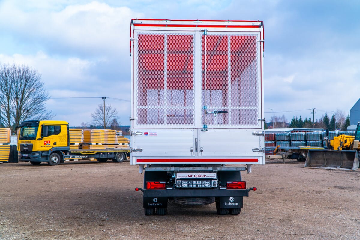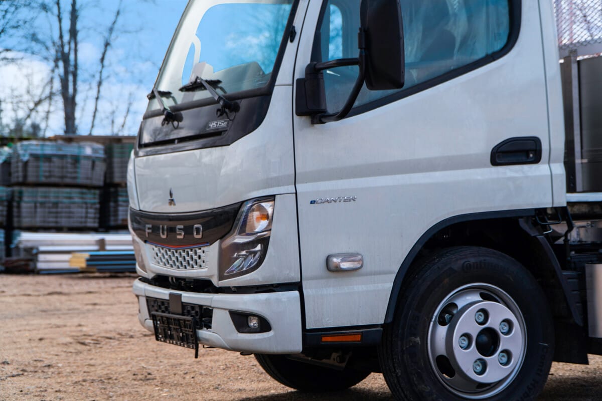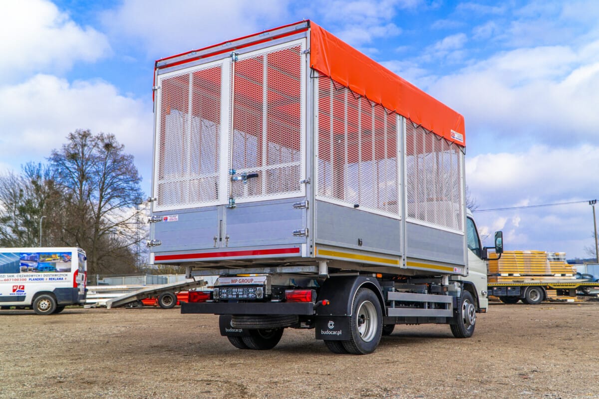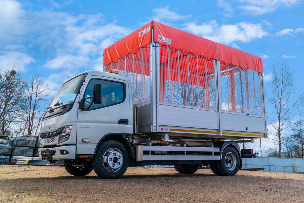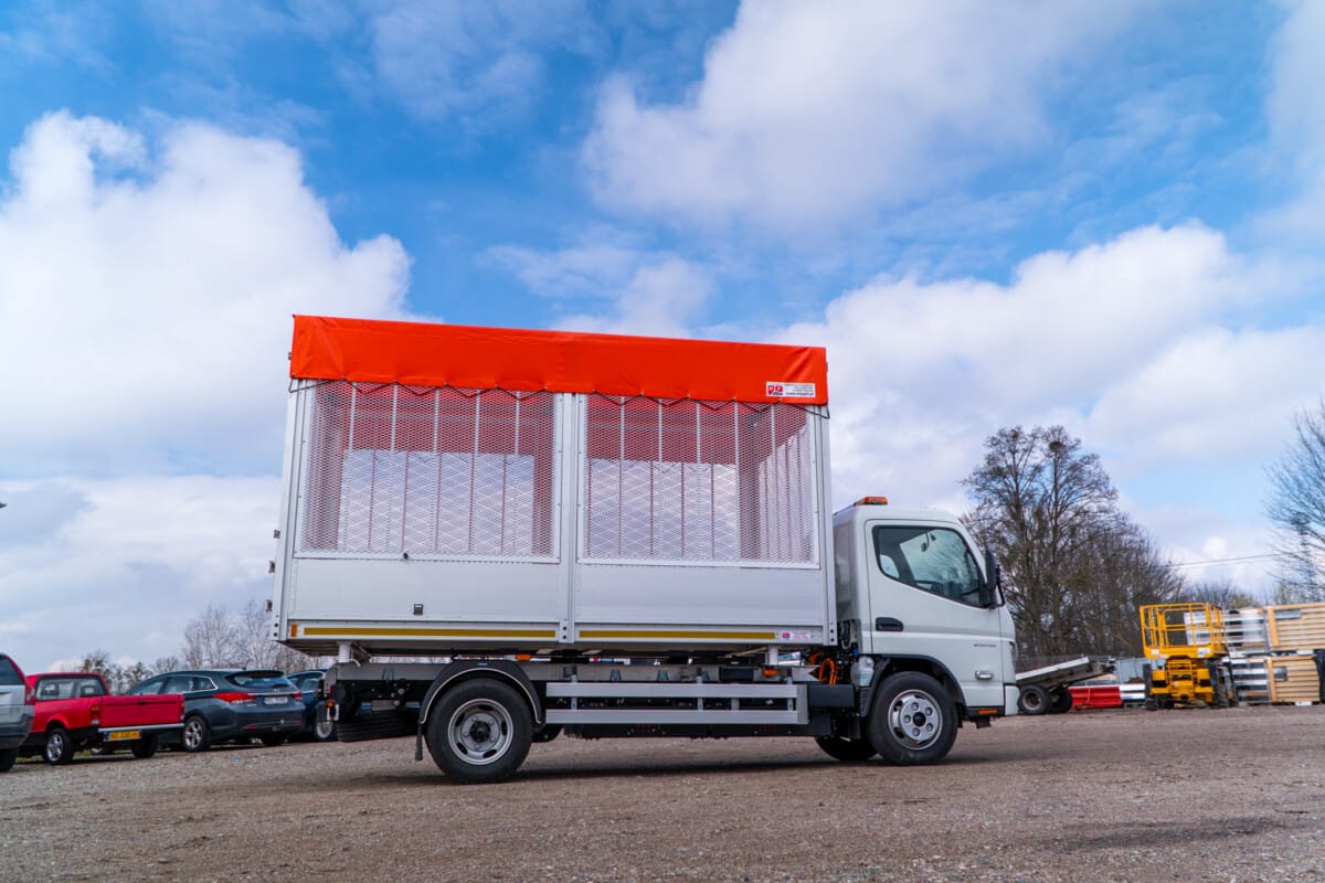 Kolejne auto elektryczne zostało przygotowane do pracy przez naszych fachowców. Mitsubishi Fuso eCanter zostało zabudowane lekką aluminiową wywrotką nakrytą od góry jaskrawą pomarańczową plandeką.