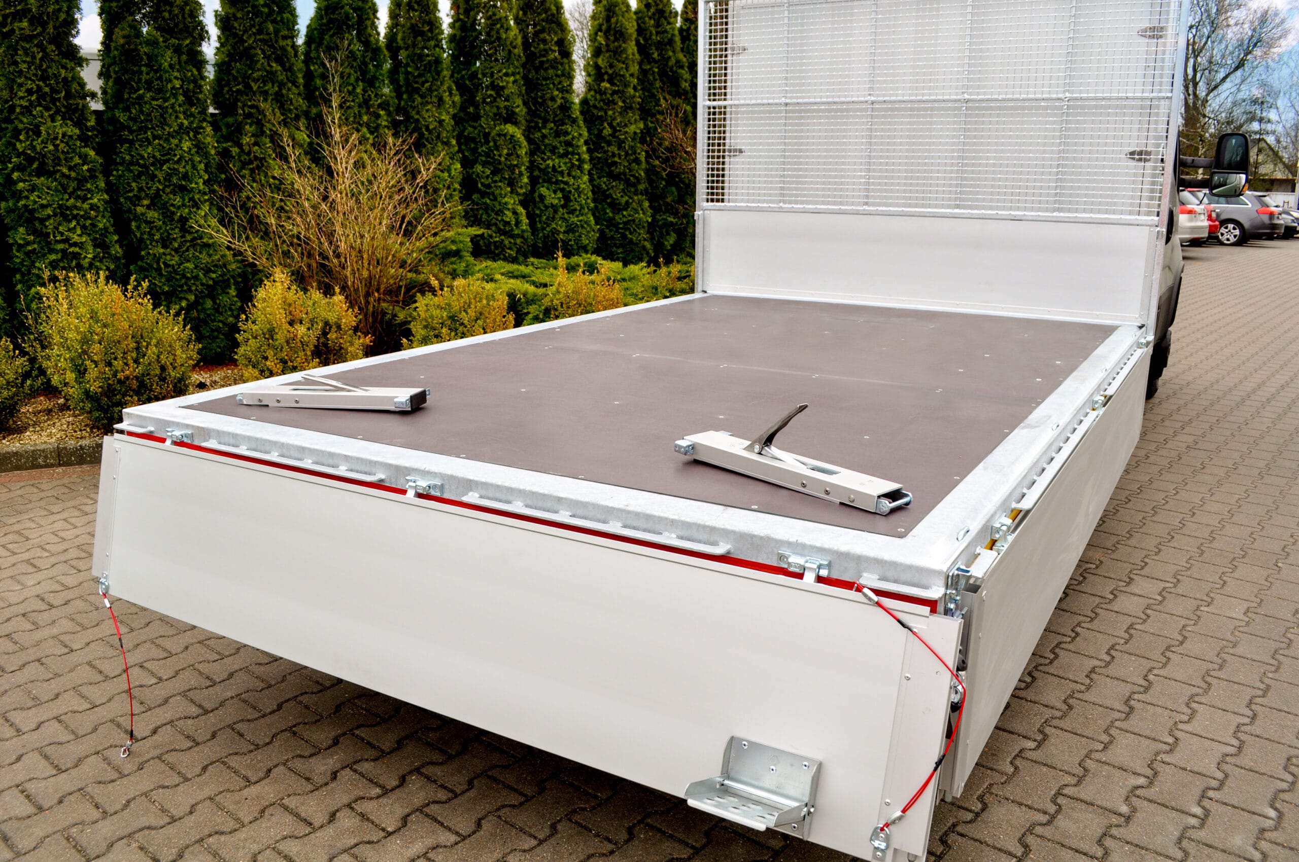 Zabudowa wykonana jest z lekkich, ale wytrzymałych materiałów, które zapewniają odporność na intensywne użytkowanie. Aluminiowe burty skrzyni są otwierane z trzech stron, co znacząco ułatwia załadunek i rozładunek – nawet w trudniejszych warunkach terenowych. Dodatkowo, dzięki solidnym zawiasom i zabezpieczeniom, skrzynia jest stabilna i bezpieczna w transporcie.