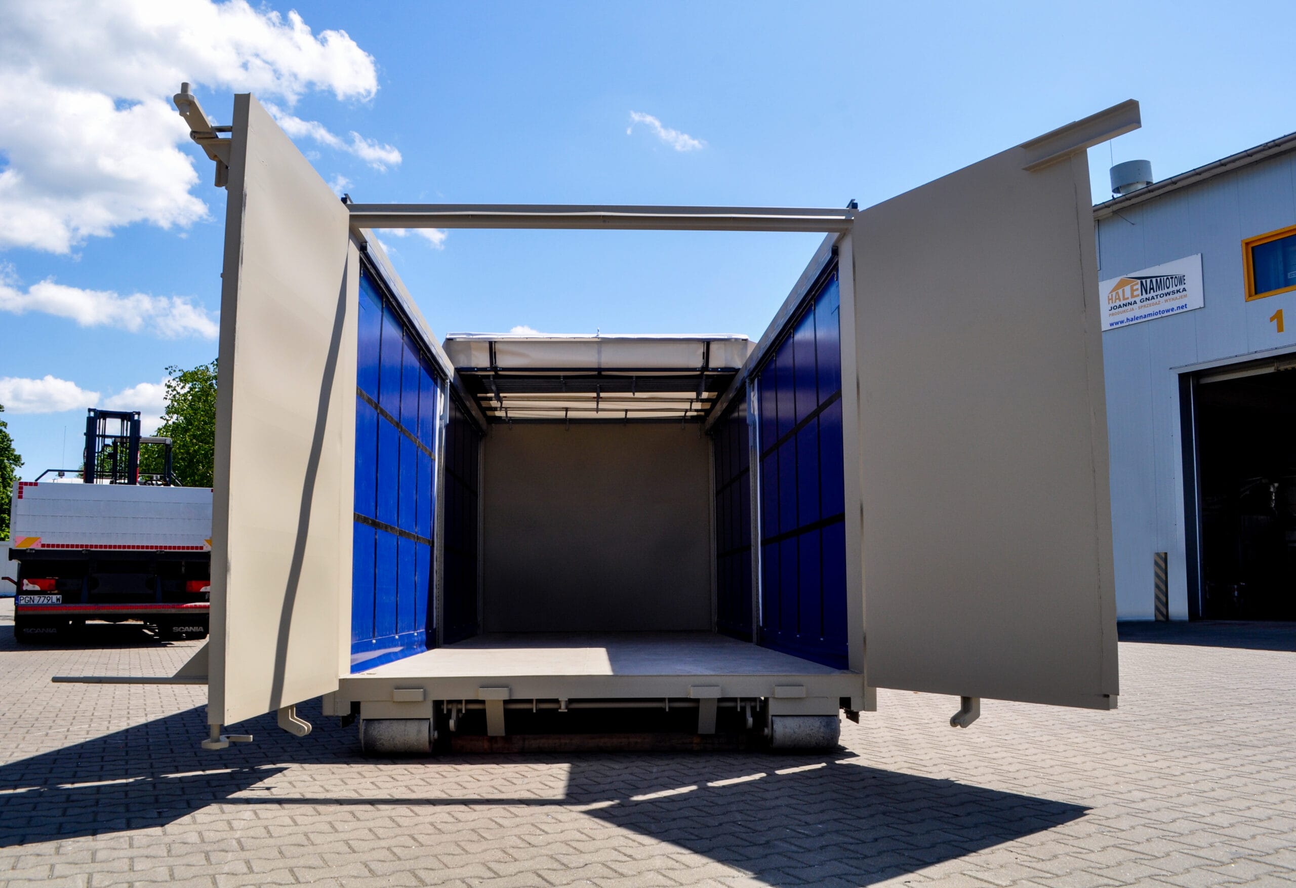 - Łatwy dostęp z trzech stron – dzięki otwieranym drzwiom oraz rozsuwanej plandece dachowej.