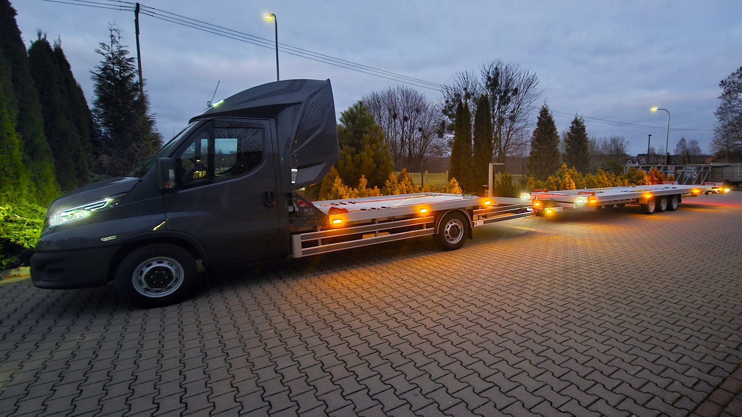 Na zdjęciach prezentujemy nasz zestaw transportowy w wyjątkowej, nocnej odsłonie. Autolaweta Iveco z kabiną sypialną oraz 3-osiowa przyczepa – obie w eleganckim, antracytowym kolorze – tworzą nowoczesny i spójny wizualnie duet, który nie tylko imponuje możliwościami technicznymi, ale także przyciąga wzrok estetyką wykonania.