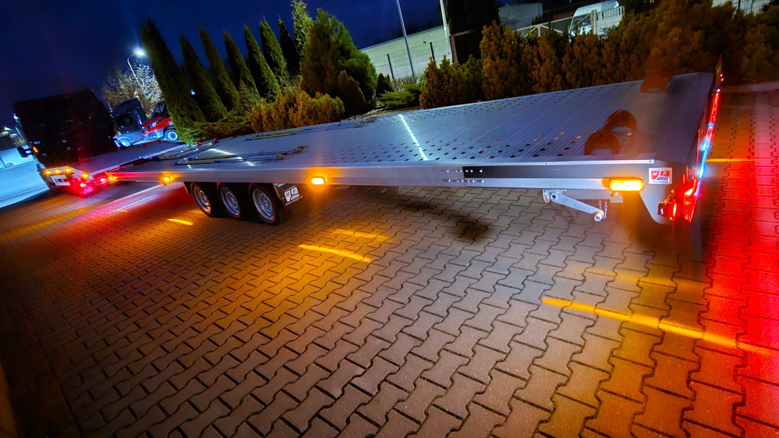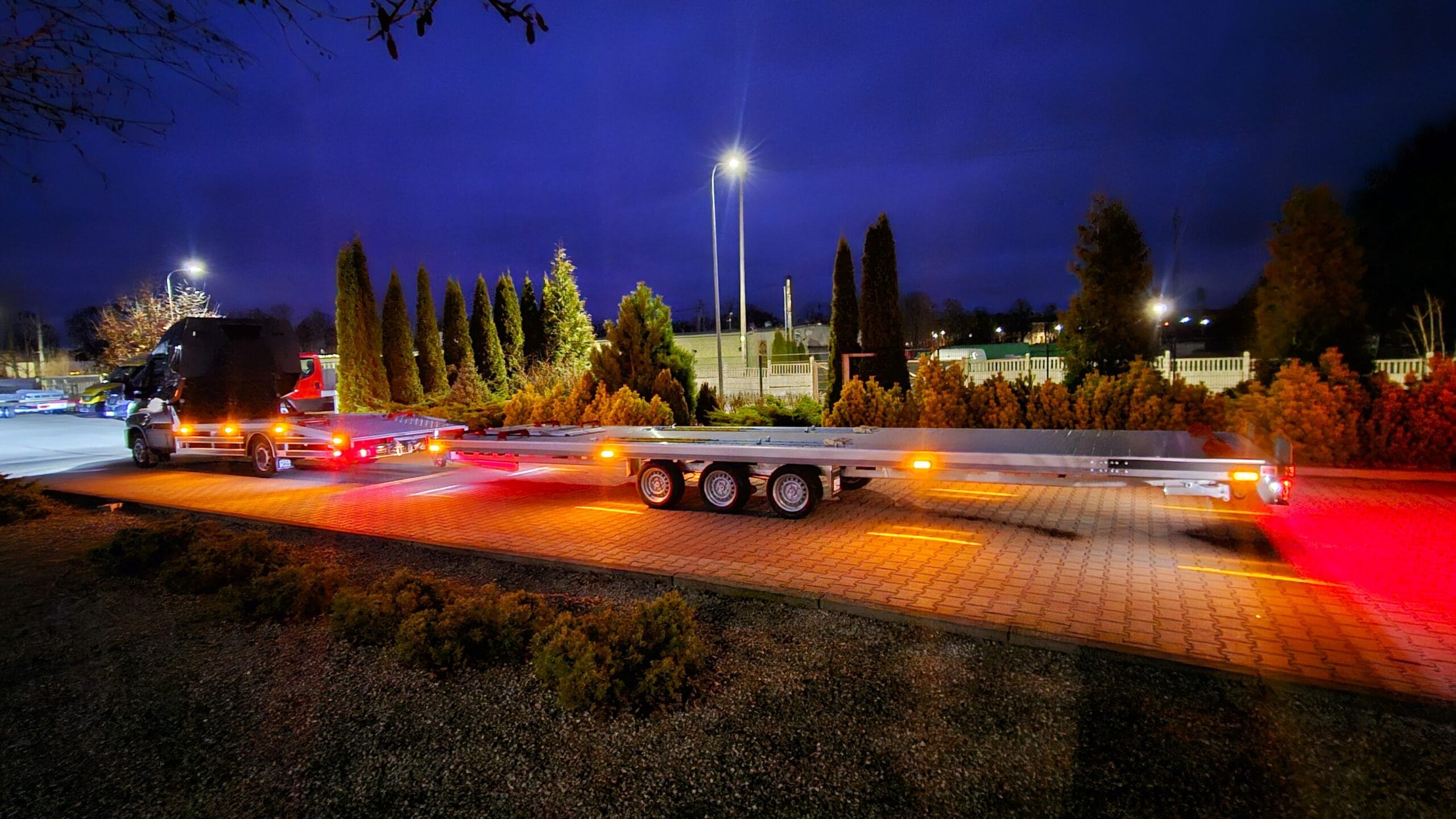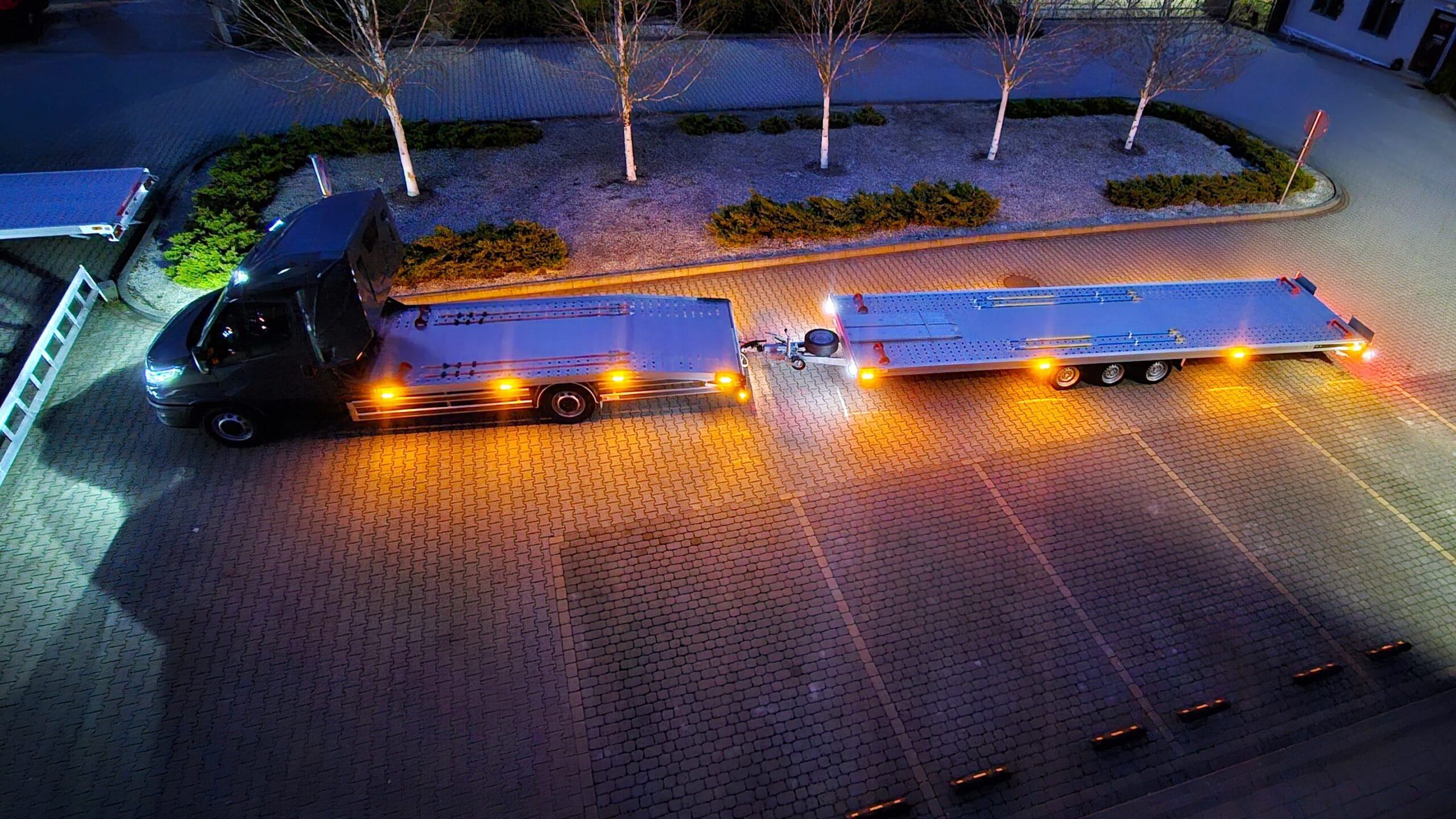 Zdjęcia zostały wykonane nocą, co pozwoliło uwydatnić efektowne oświetlenie zestawu. Wbudowane lampy obrysowe tworzą wyjątkowy klimat – światła precyzyjnie podkreślają kształt lawety i przyczepy, a całość nabiera barwnego, niemal futurystycznego charakteru. To pokazuje, że transport może być nie tylko praktyczny, ale również stylowy.