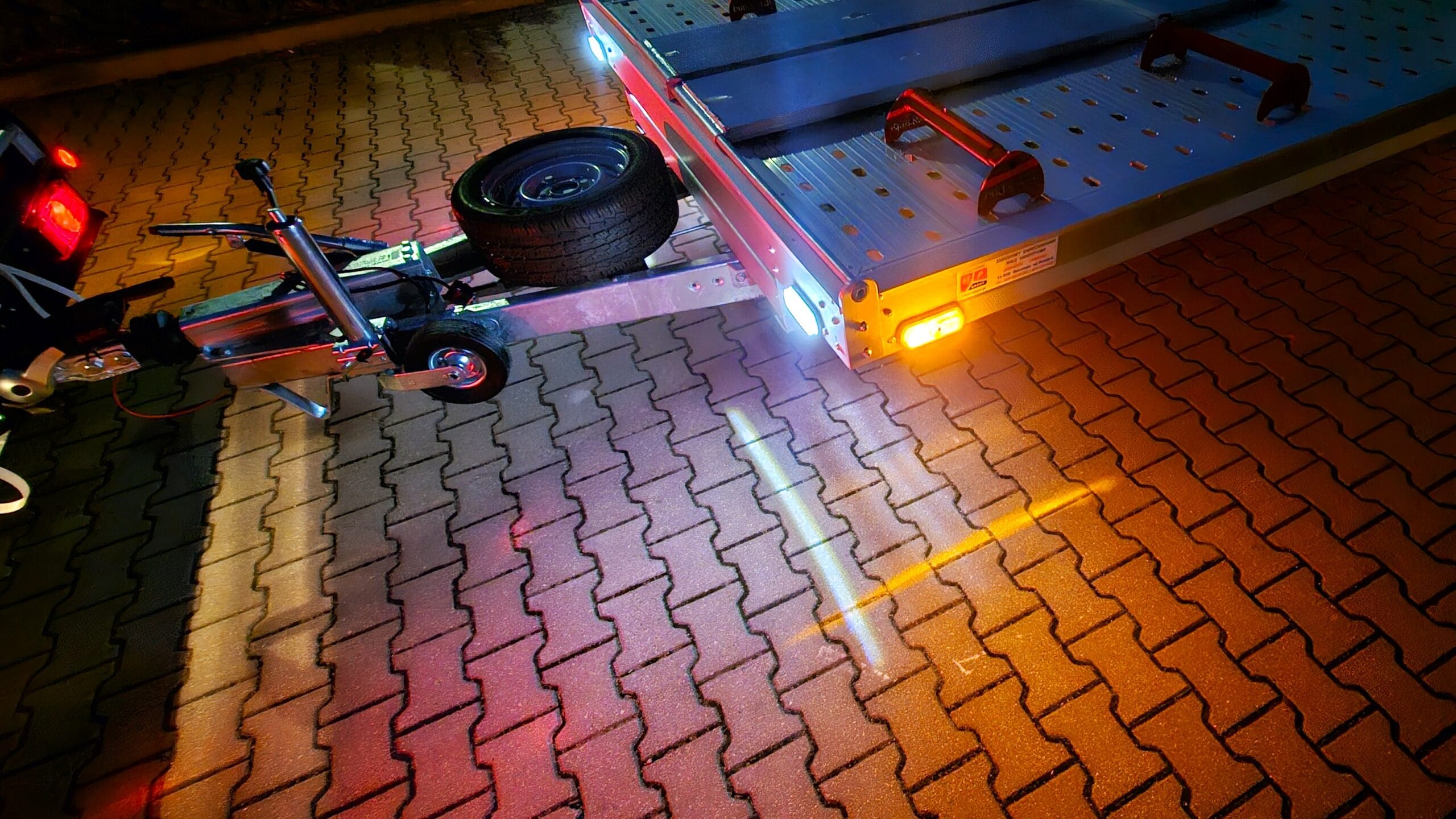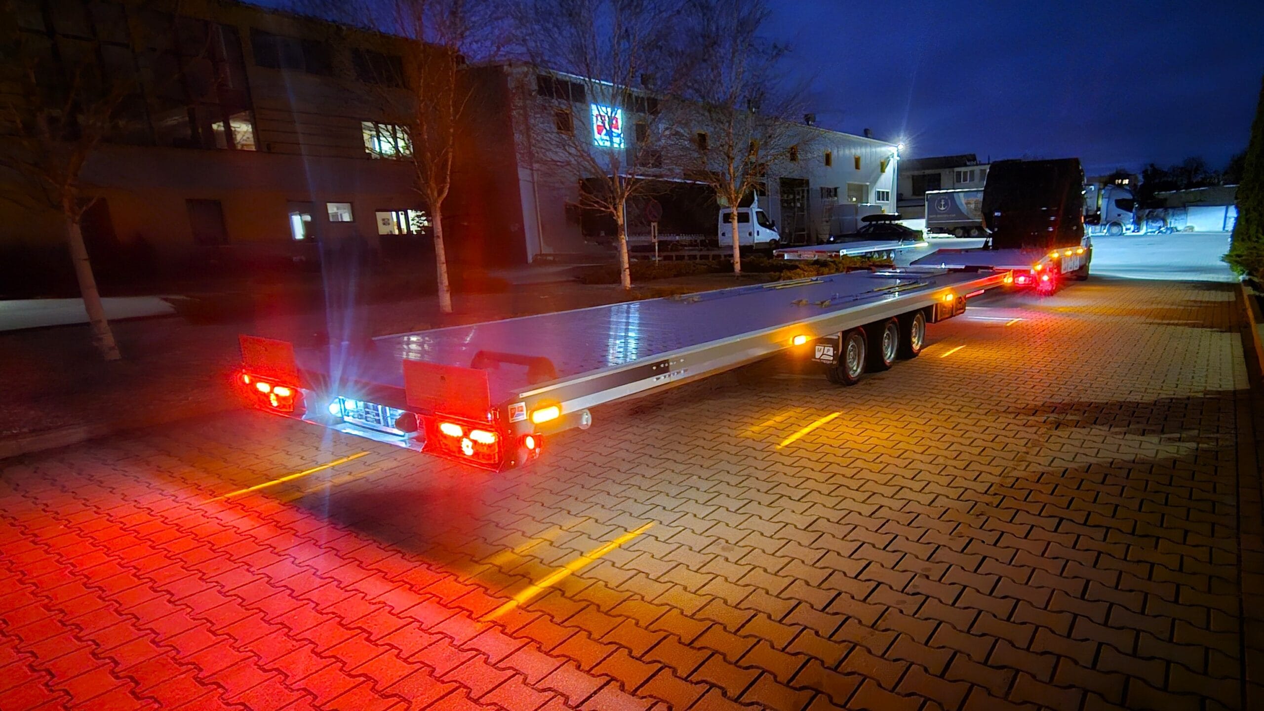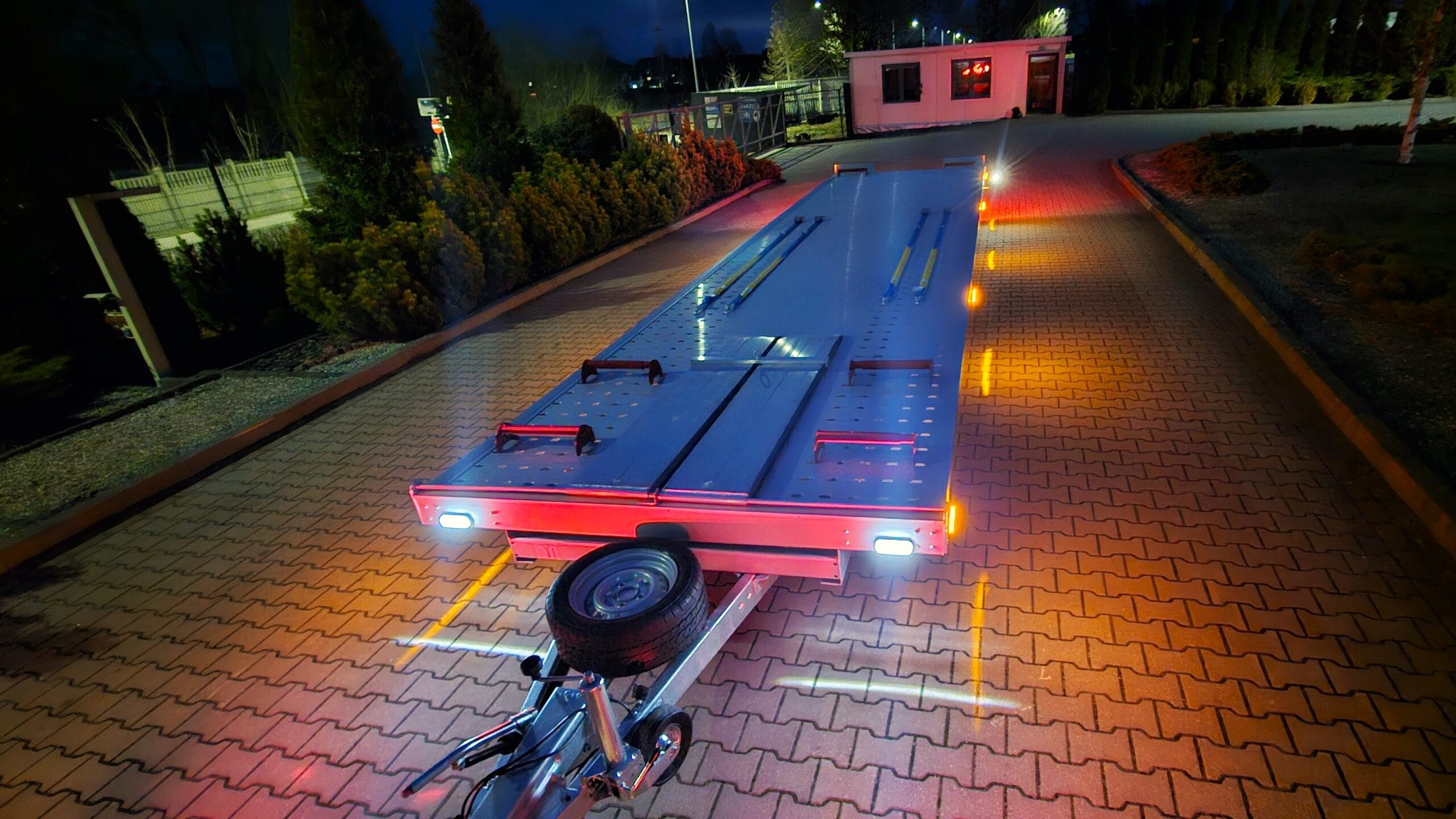 Zdjęcia zostały wykonane nocą, co pozwoliło uwydatnić efektowne oświetlenie zestawu. Wbudowane lampy obrysowe tworzą wyjątkowy klimat – światła precyzyjnie podkreślają kształt lawety i przyczepy, a całość nabiera barwnego, niemal futurystycznego charakteru. To pokazuje, że transport może być nie tylko praktyczny, ale również stylowy.