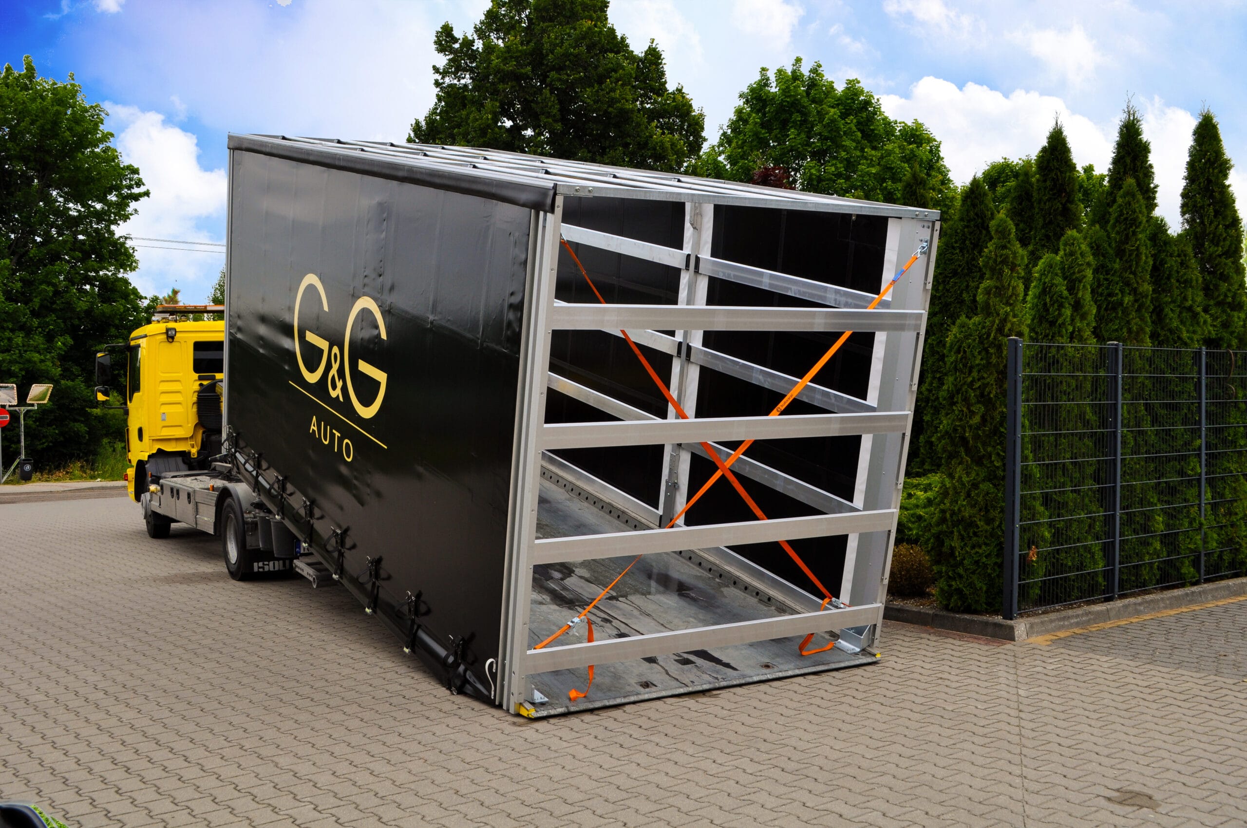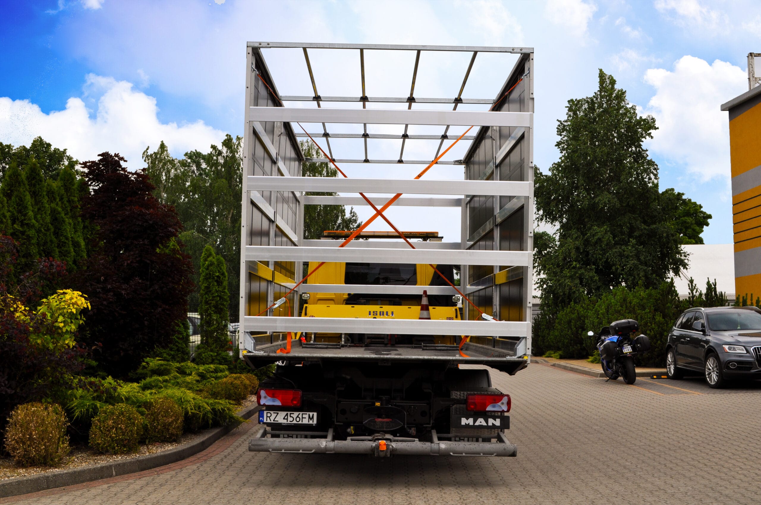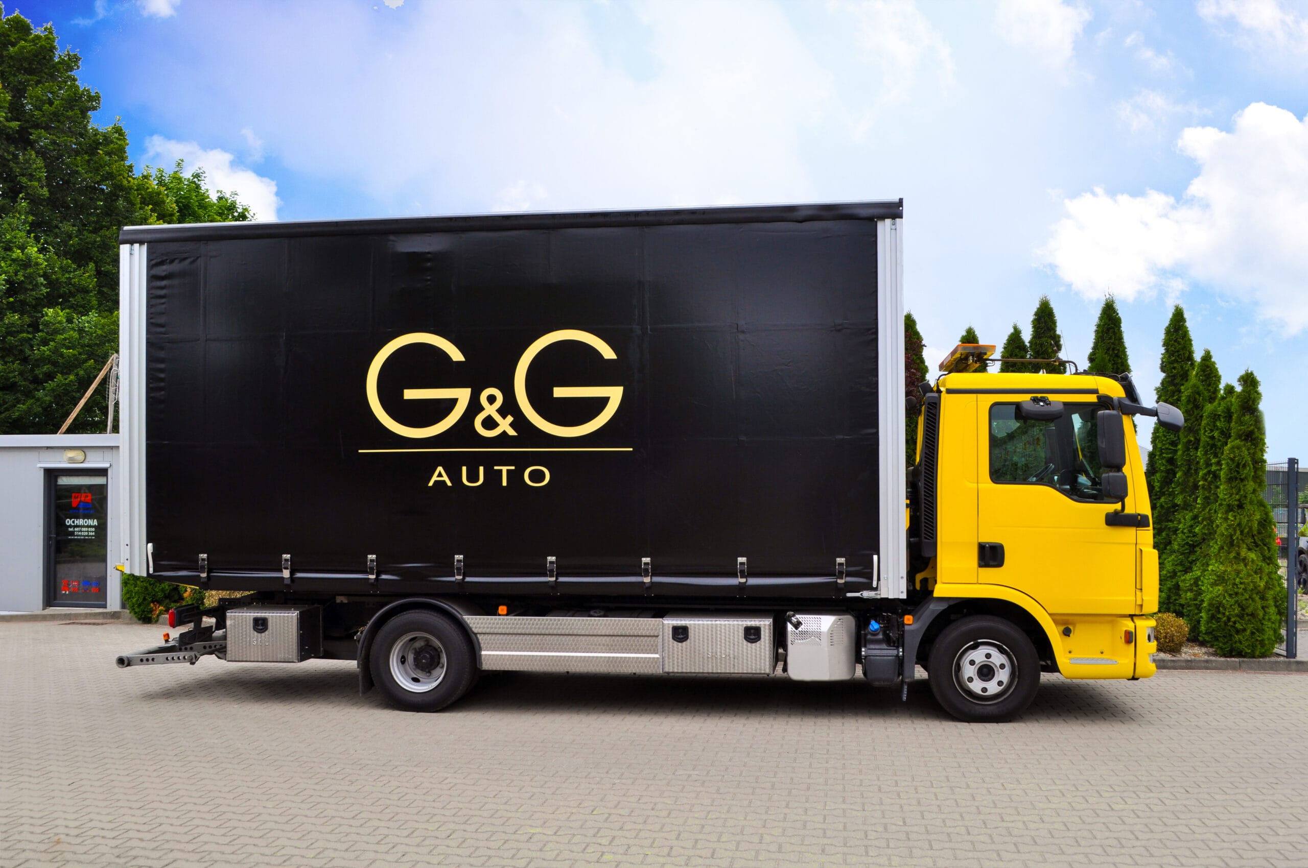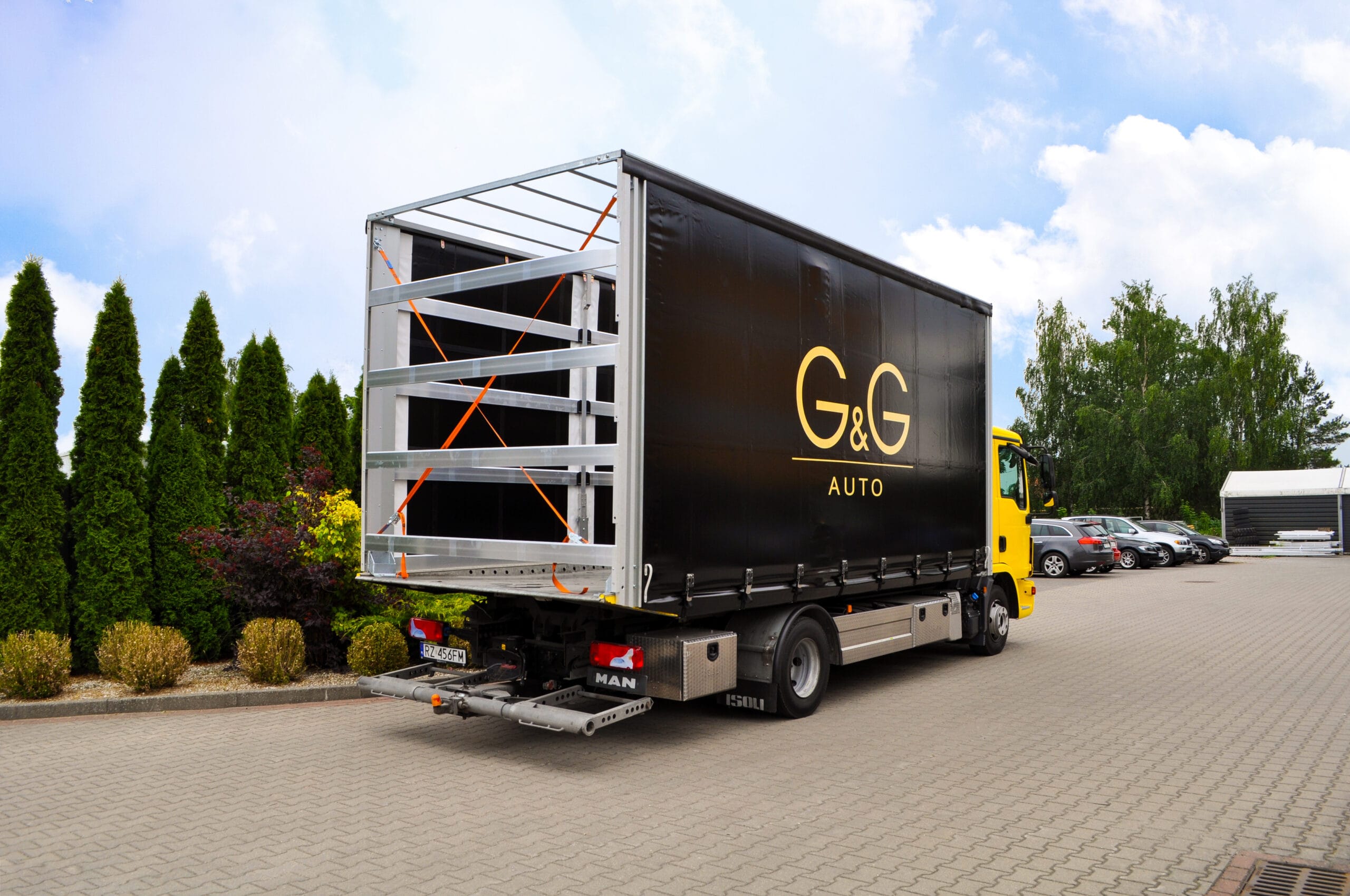 Na zdjęciu możecie zobaczyć pojazd z logiem klienta. Wyposażony został w nowoczesną, solidną zabudowę przeznaczoną do transportu samochodów. Obecnie jesteśmy w trakcie dopasowywania jej do indywidualnych potrzeb klienta. Finalna wersja zabudowy będzie w pełni przystosowana do bezpiecznego transportu pojazdów luksusowych i sportowych. Szczególnie z naciskiem na zabezpieczenie i łatwość obsługi.