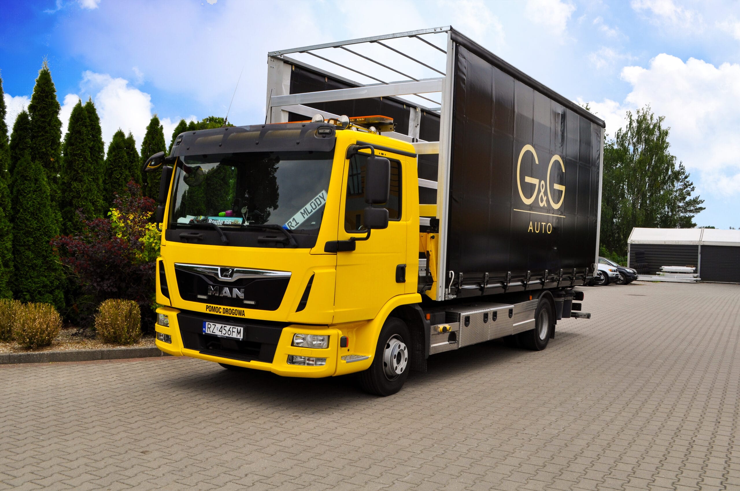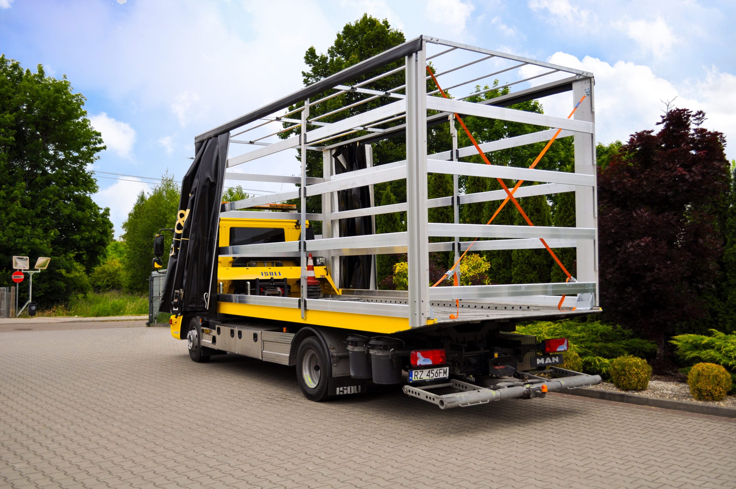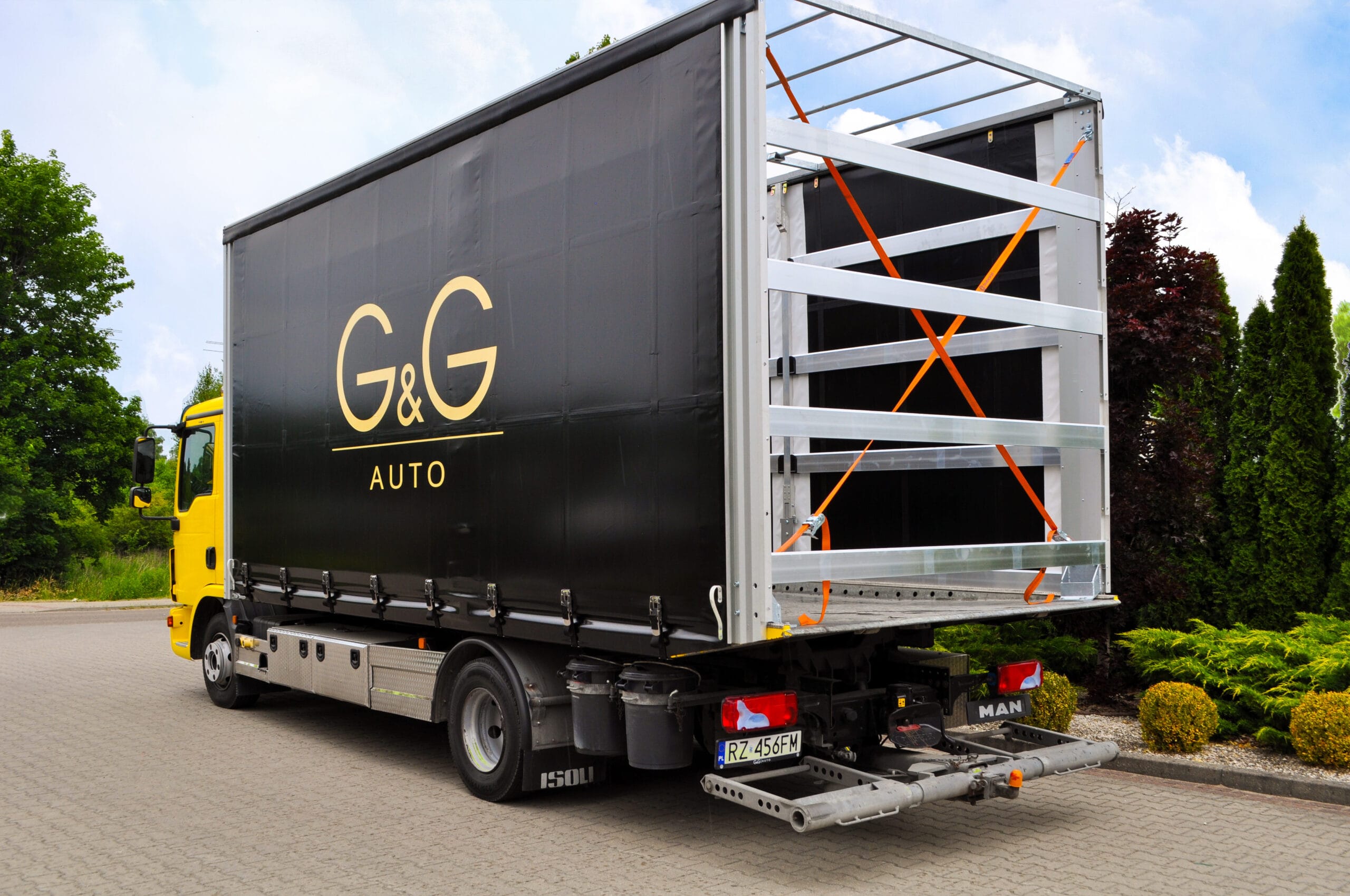 Na zdjęciu możecie zobaczyć pojazd z logiem klienta. Wyposażony został w nowoczesną, solidną zabudowę przeznaczoną do transportu samochodów. Obecnie jesteśmy w trakcie dopasowywania jej do indywidualnych potrzeb klienta. Finalna wersja zabudowy będzie w pełni przystosowana do bezpiecznego transportu pojazdów luksusowych i sportowych. Szczególnie z naciskiem na zabezpieczenie i łatwość obsługi.