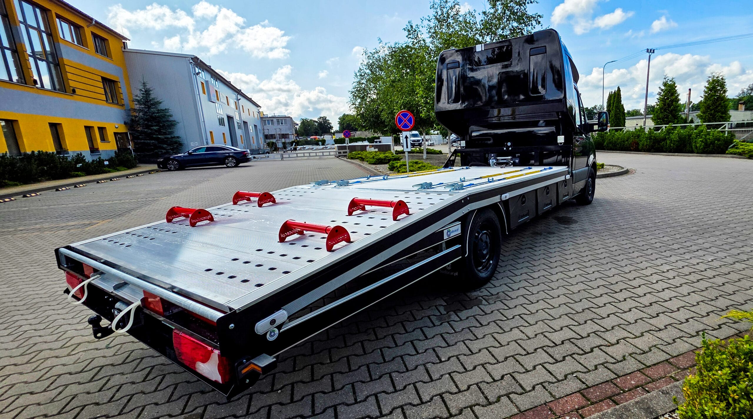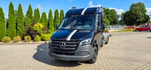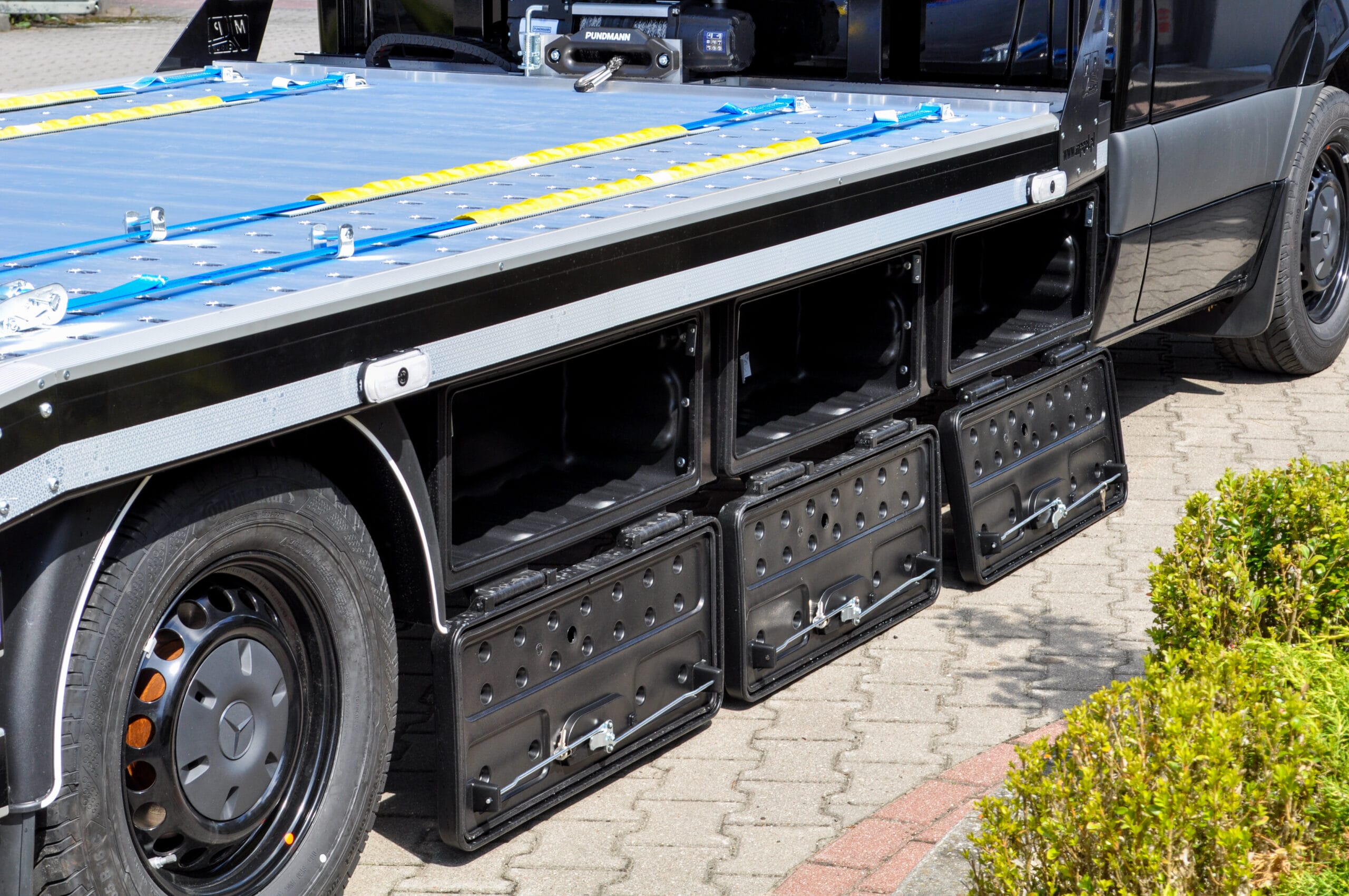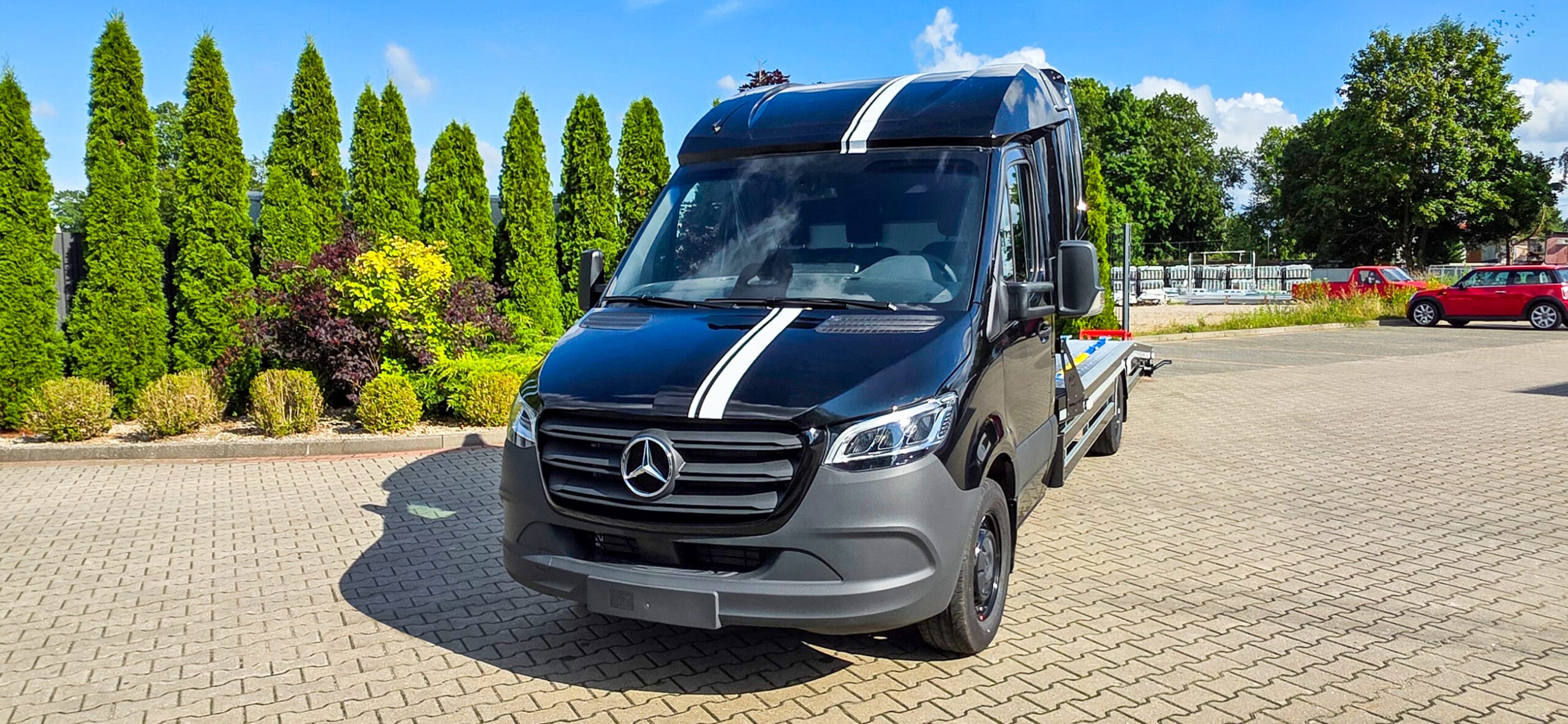 Mercedes Sprinter z aluminiową platformą i kabiną sypialną niebawem wyrusza w trasę, a jej właściciel może cieszyć się pełnym wyposażeniem auta, w skład którego wchodzą: