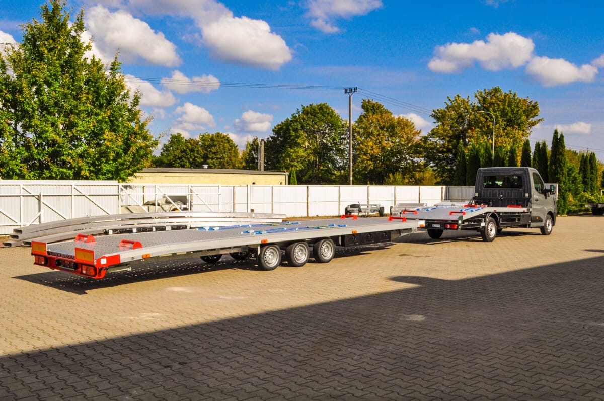 Zestaw składa się z lawety na podwoziu Renault Master oraz trzyosiowej przyczepy typu najazdowego, tworząc przestrzeń ładunkową o imponującej długości. Całość została wykonana z wysokogatunkowej stali ocynkowanej, co zapewnia odporność na korozję i wieloletnią trwałość.