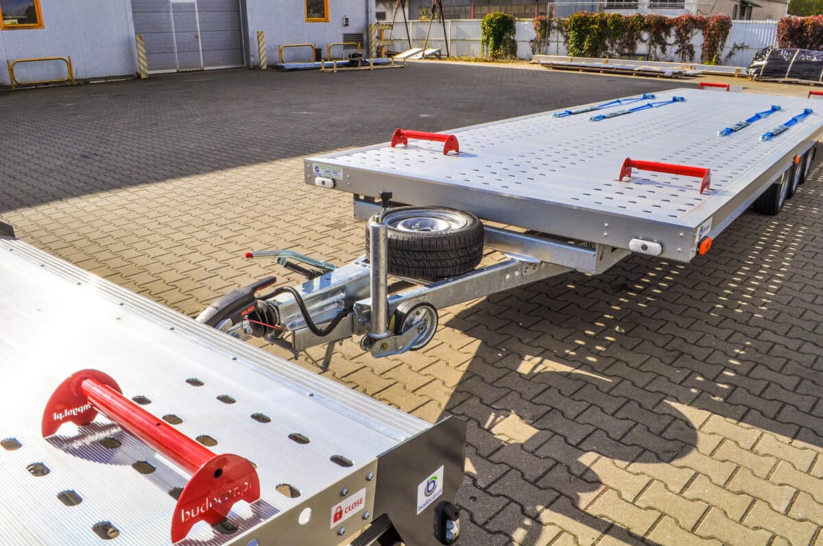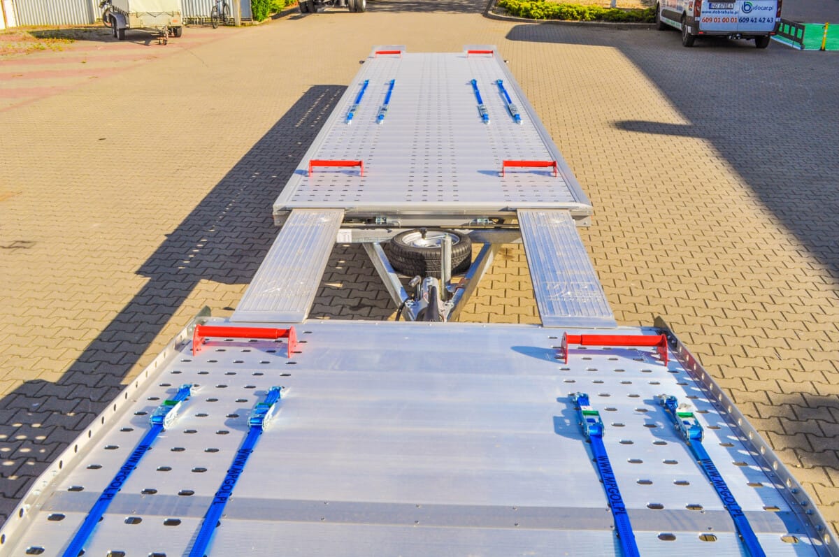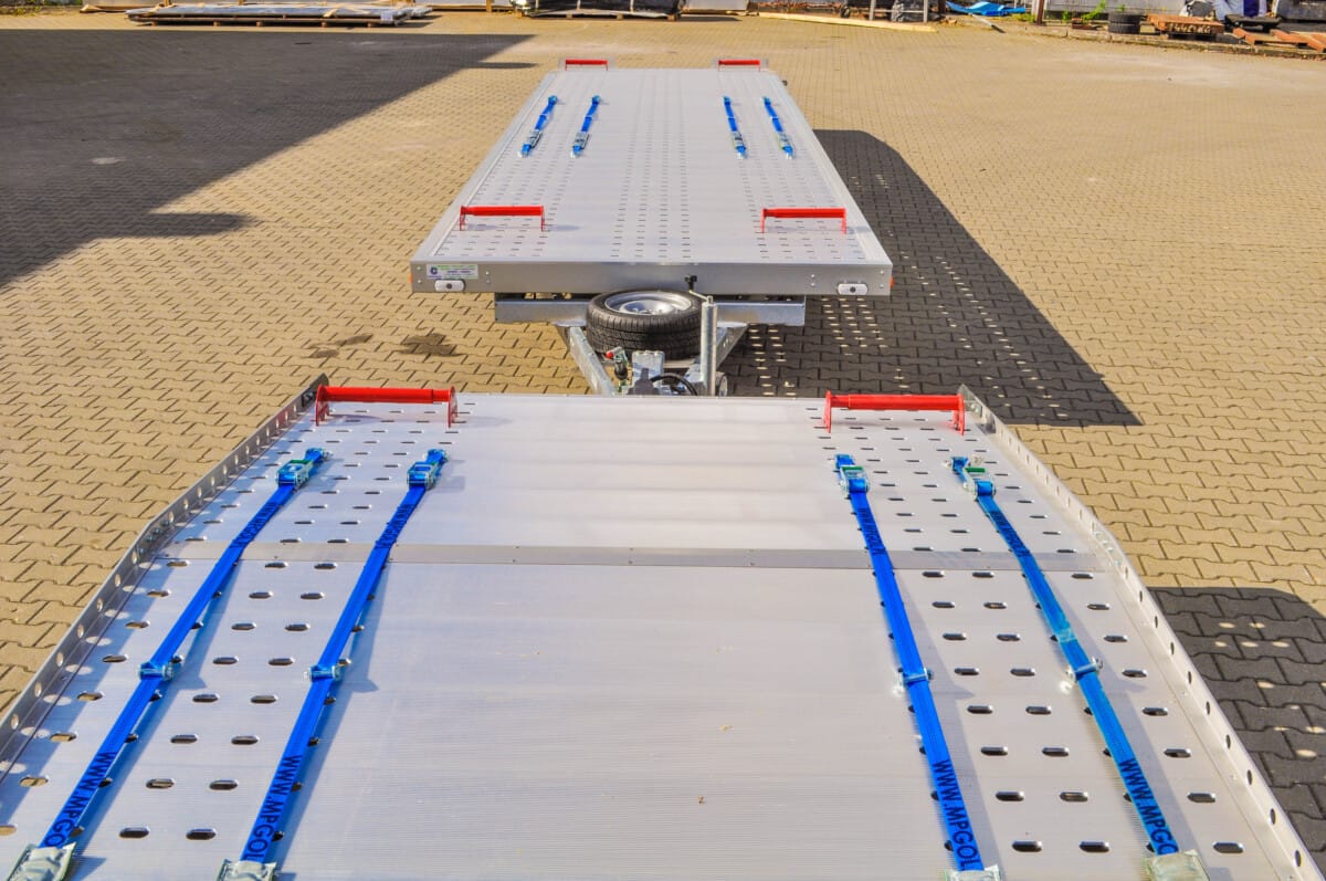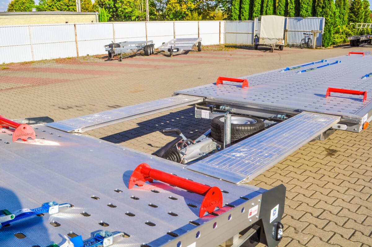 Perforowana powierzchnia platformy ułatwia mocowanie kół i pasów transportowych, a liczne uchwyty i punkty zaczepowe umożliwiają szybkie i bezpieczne zabezpieczenie pojazdów. Dodatkowo, system zaczepu przyczepy wyposażono w praktyczne rozwiązania – m.in. koło podporowe, mocowanie koła zapasowego i stabilizator toru jazdy.