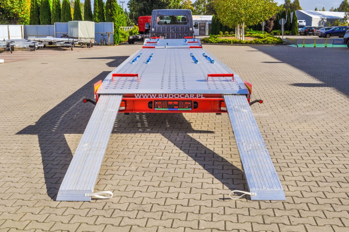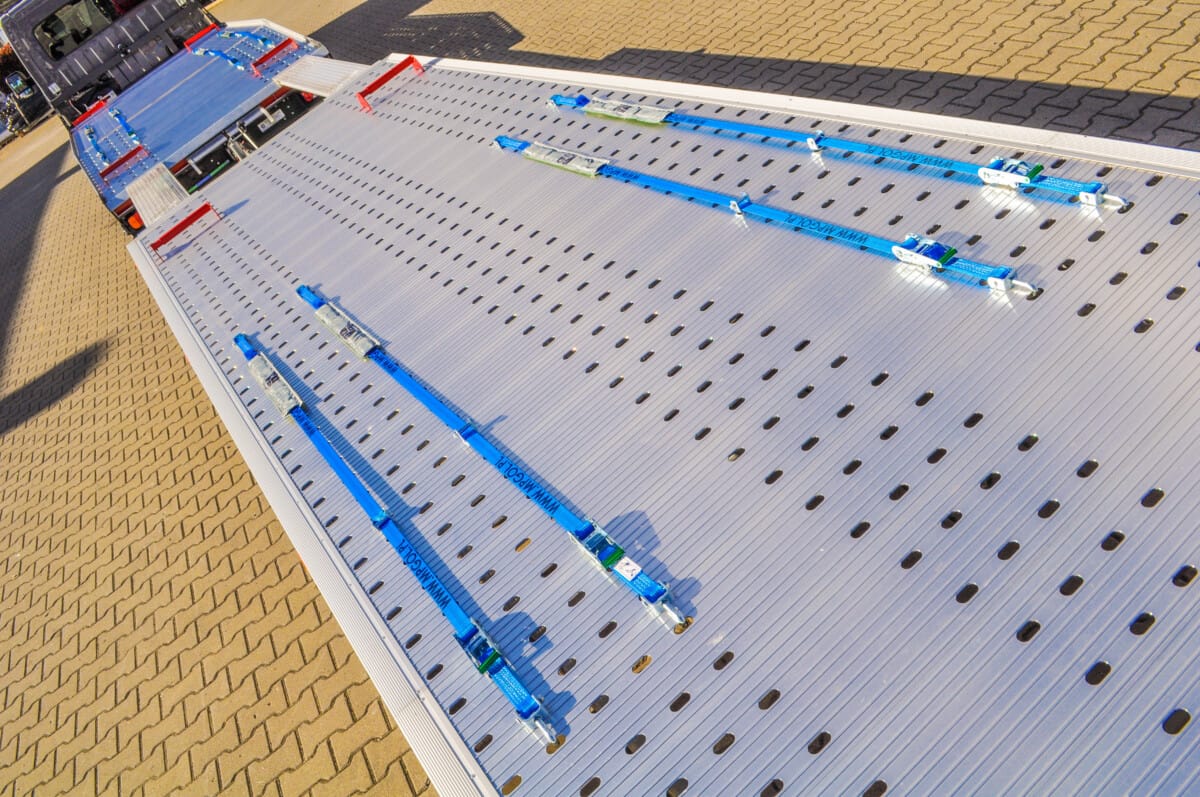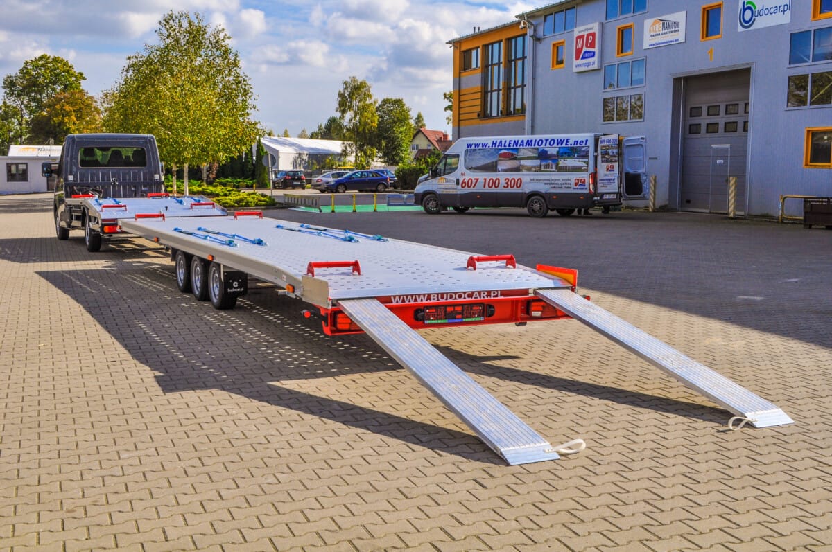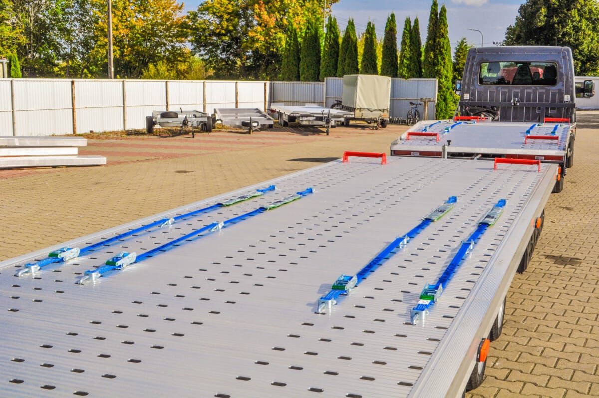 Perforowana powierzchnia platformy ułatwia mocowanie kół i pasów transportowych, a liczne uchwyty i punkty zaczepowe umożliwiają szybkie i bezpieczne zabezpieczenie pojazdów. Dodatkowo, system zaczepu przyczepy wyposażono w praktyczne rozwiązania – m.in. koło podporowe, mocowanie koła zapasowego i stabilizator toru jazdy.