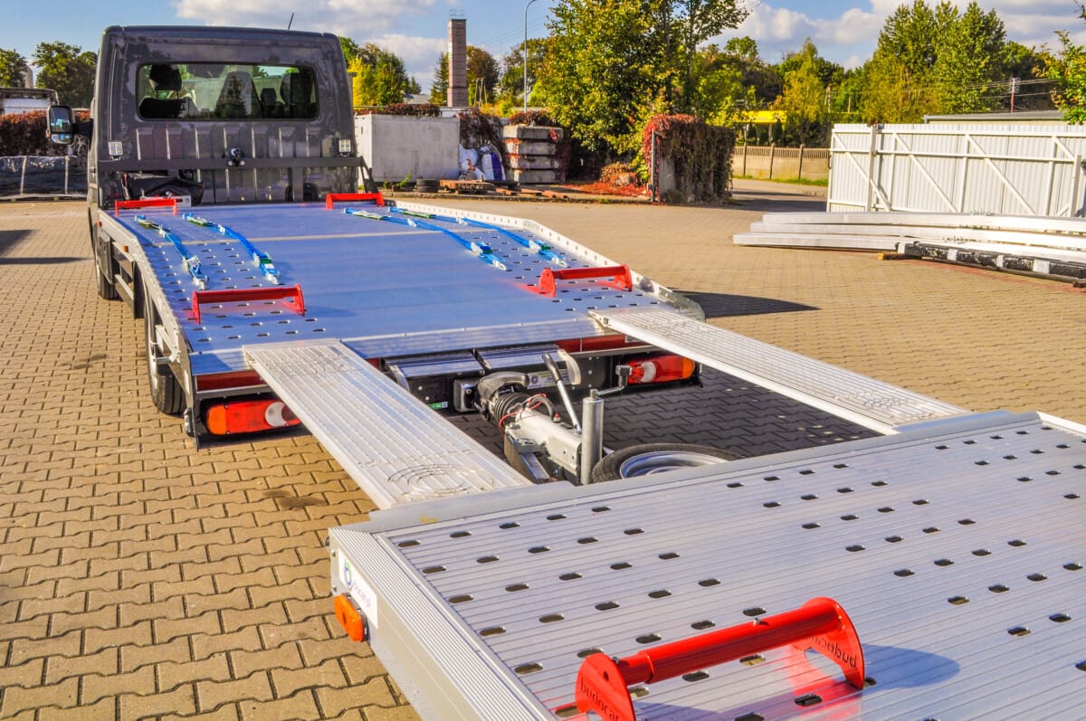 Zabudowa została zaprojektowana z myślą o codziennej pracy firm transportowych i pomoc drogowych. Solidna rama, odpowiednie rozłożenie masy oraz hydrauliczne wspomaganie zjazdu pozwalają na łatwe i szybkie załadunki nawet nisko zawieszonych pojazdów. Zestaw wyposażony jest w pełne oświetlenie LED, które gwarantuje widoczność i bezpieczeństwo w każdych warunkach.