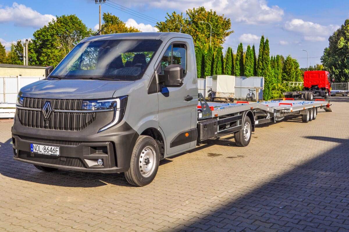 Zestaw nie tylko spełnia najwyższe standardy techniczne, ale także prezentuje się wyjątkowo nowocześnie. Renault Master w eleganckim szarym kolorze z nową, agresywną linią przodu idealnie komponuje się z lekką, a zarazem wytrzymałą przyczepą o czerwonych akcentach. To połączenie funkcjonalności i stylu, które podkreśla profesjonalizm Twojej firmy już na pierwszy rzut oka.