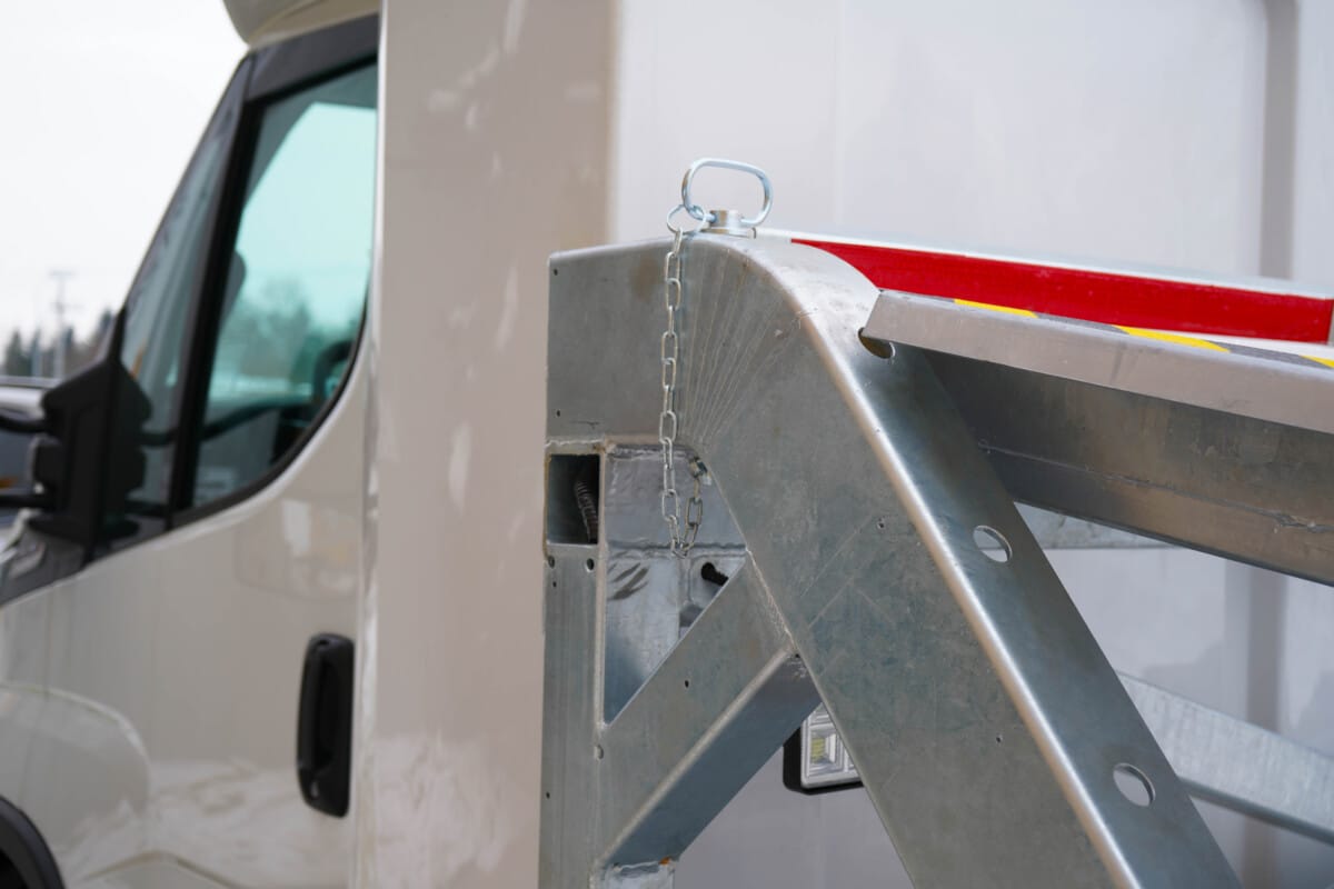 Sam najazd panelowo aluminiowy posiada certyfikat VDI 2700 8.1 oraz kabinę sypialną odpowiednią dla dwóch kierowców.