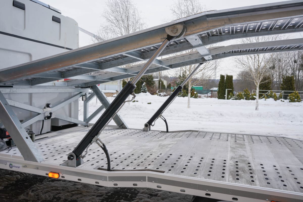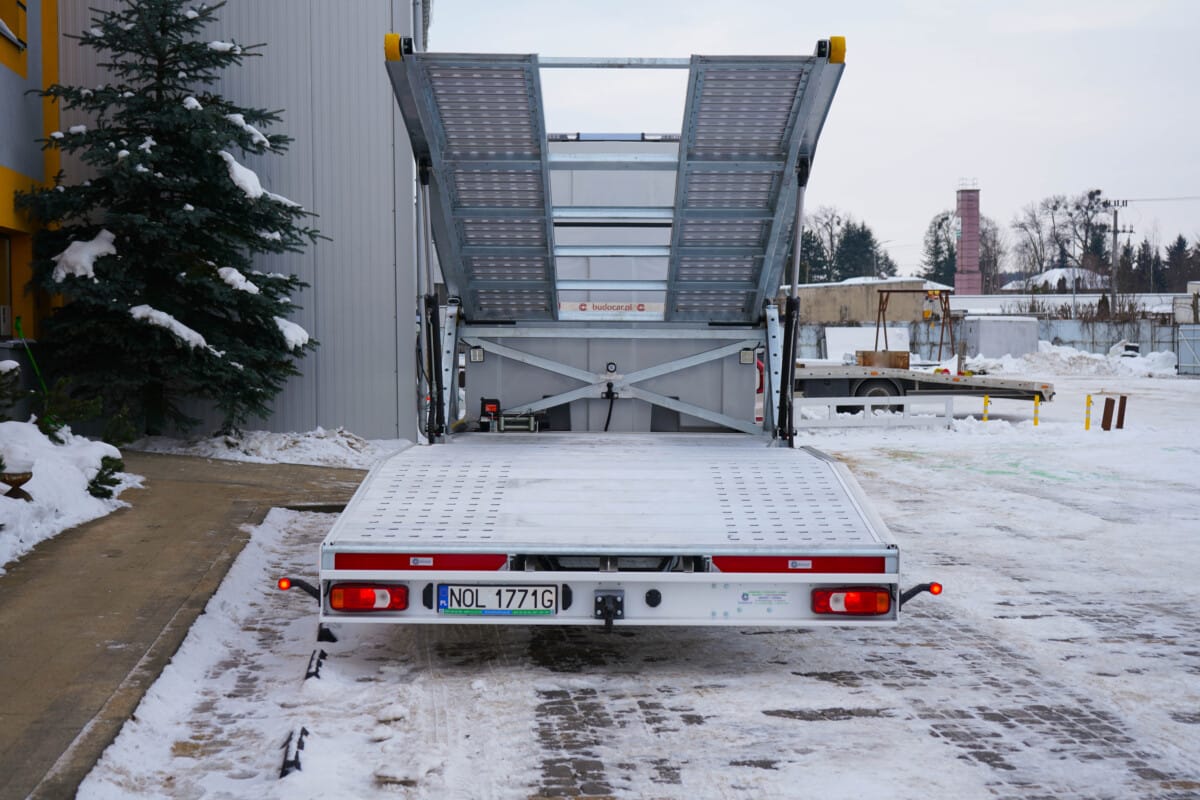 Do transportu kilku pojazdów pierwszy powinien wjechać na obniżoną platformę piętrową. Po zabezpieczeniu na niej samochodu, możemy ją unieść i przygotować miejsce dla następnego.