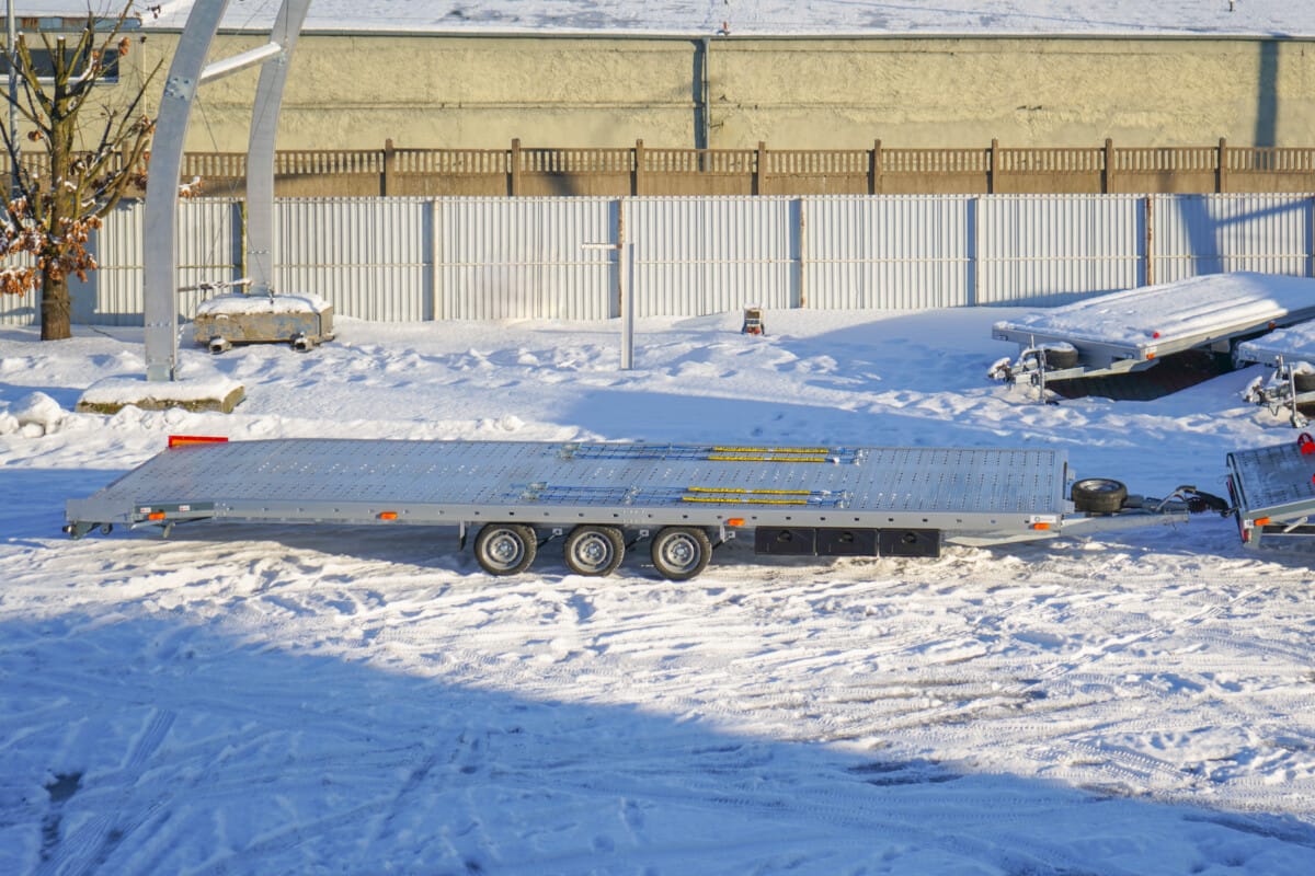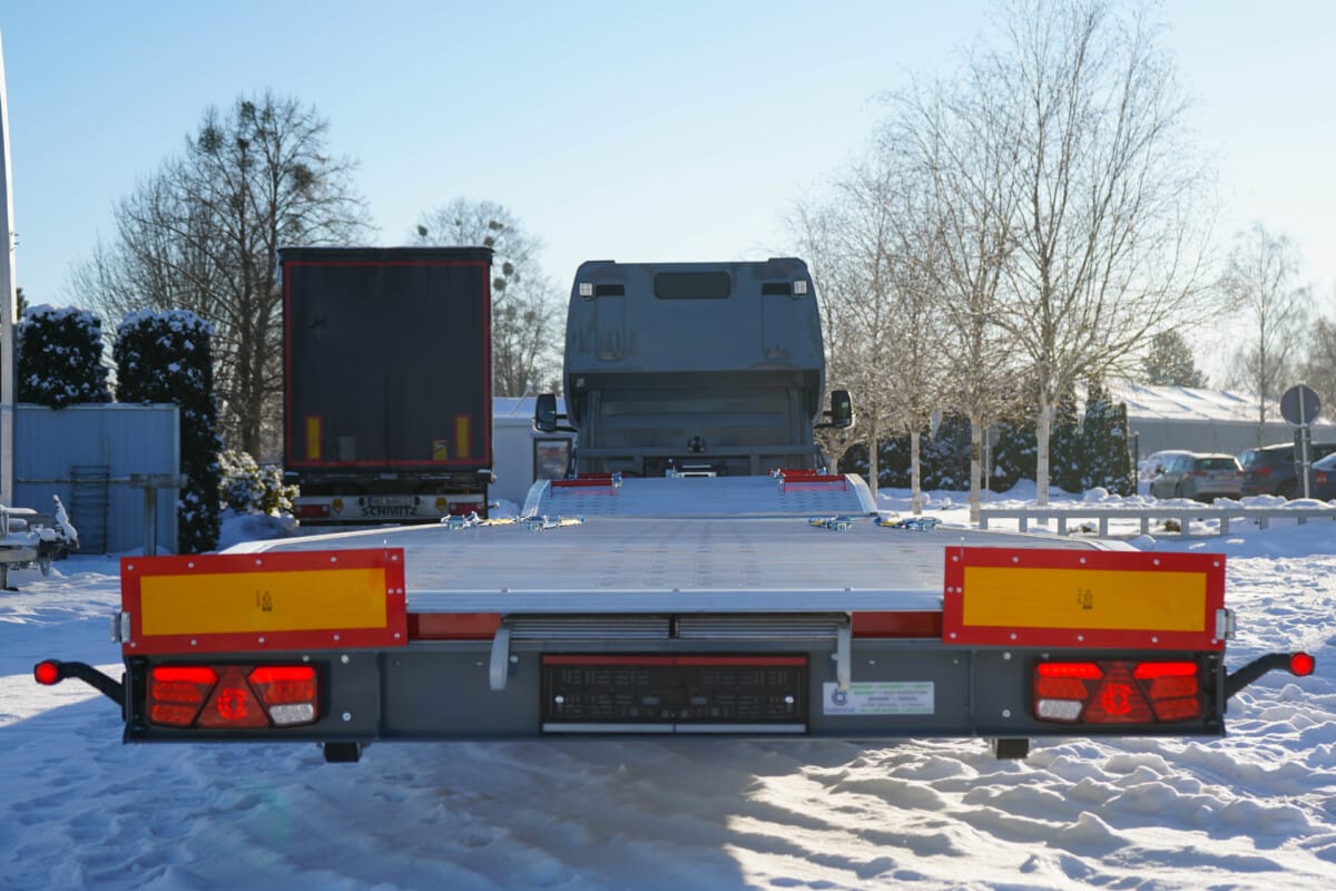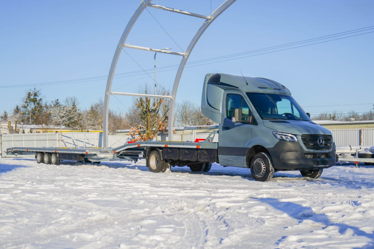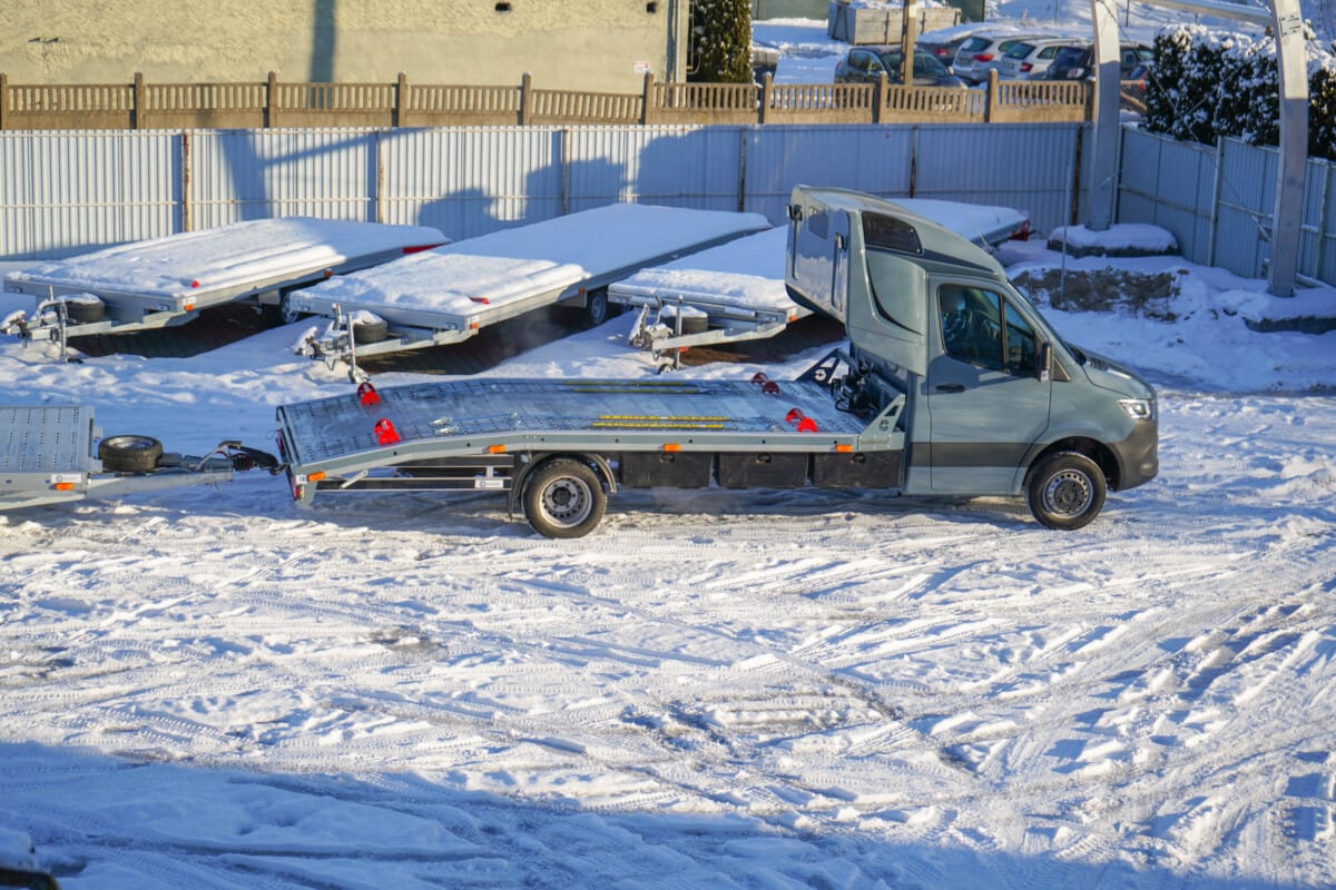 Przedstawiamy kolejne lawety wykonane przez nas. Szara autolaweta na podwoziu Mercedes Benz od dziś jest już w stanie sprostać każdym wyzwaniom w czasie pracy jako pomoc drogowa. Tuż za nią jest nasza przyczepa laweta 3-osiowa.
