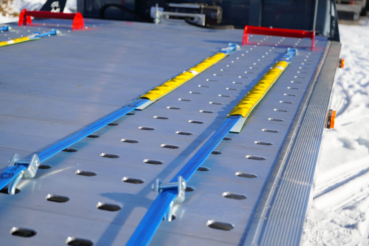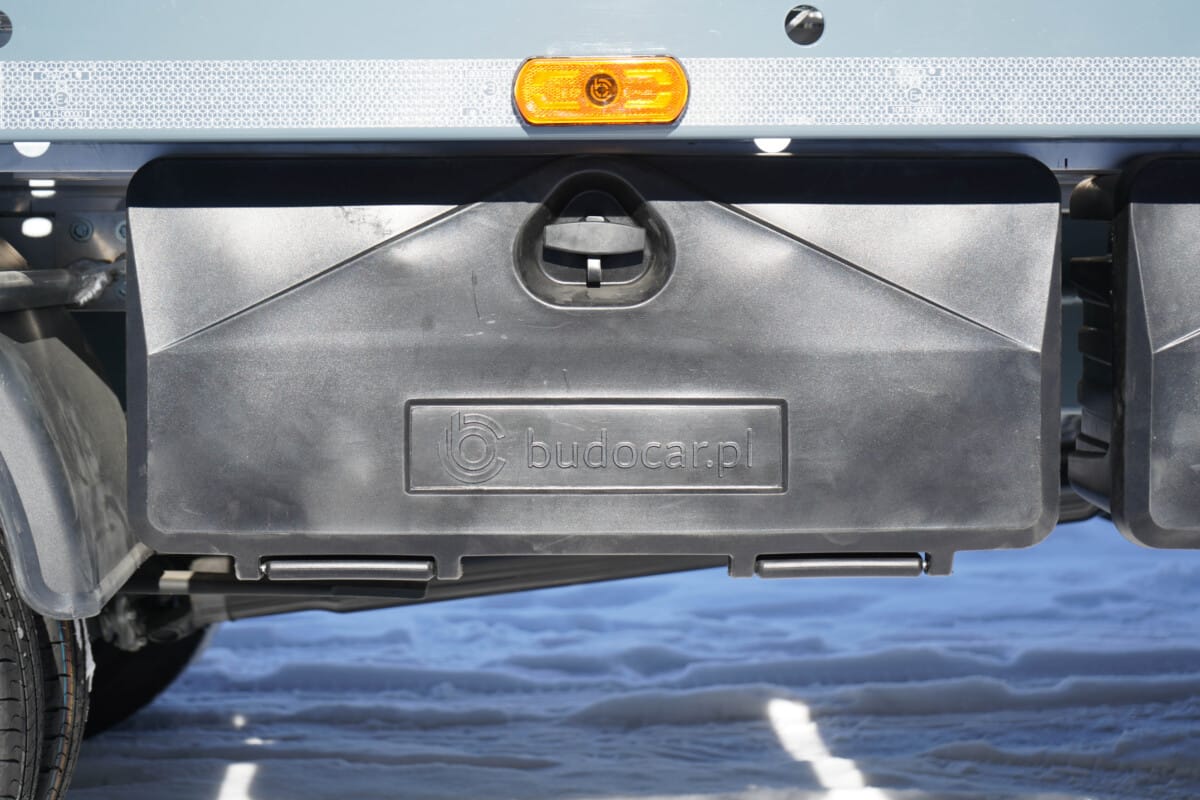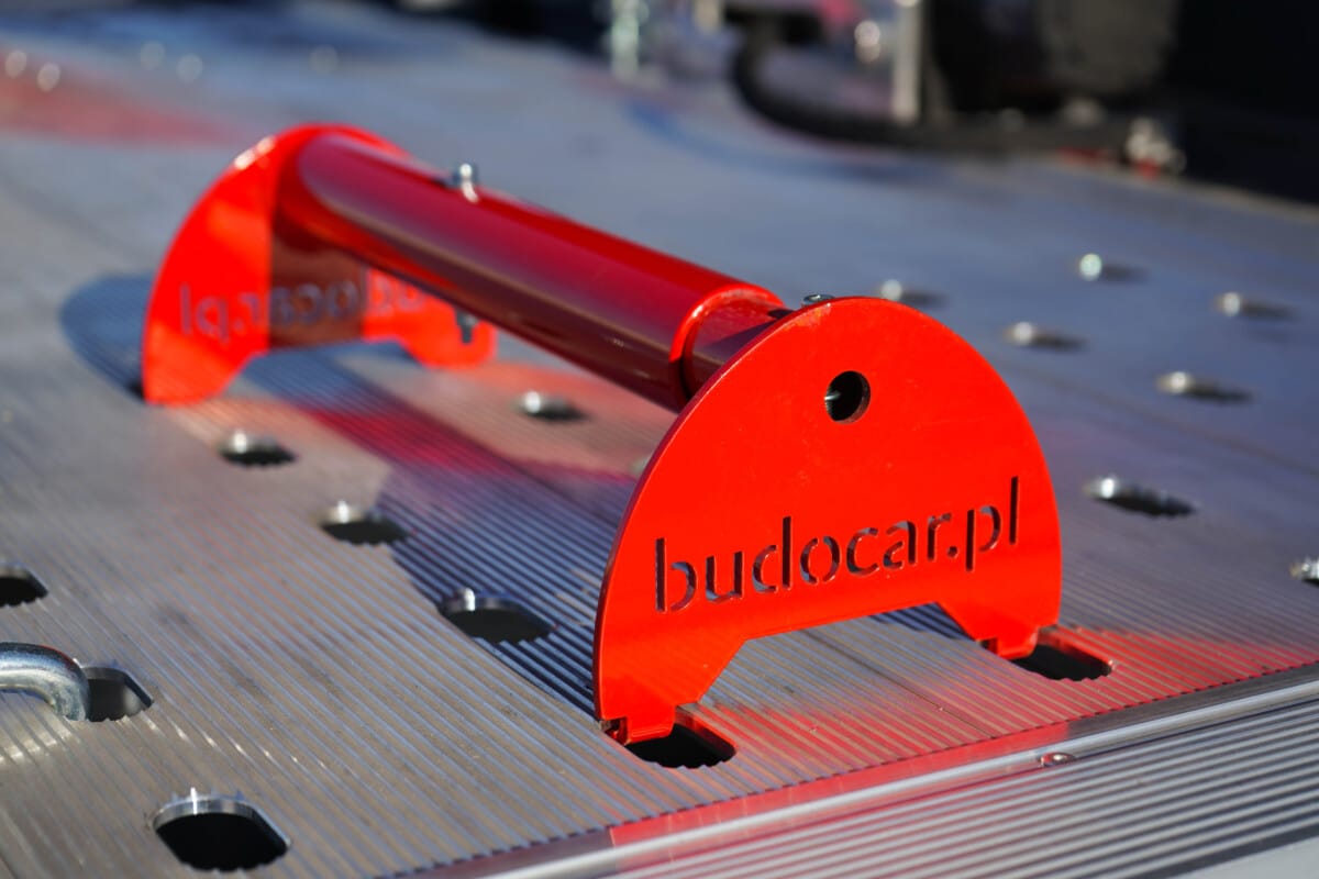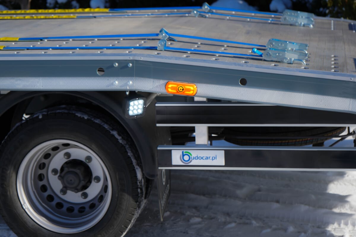 Wyposażyliśmy te lawety w kliny blokujące koła z logiem naszej firmy. Podczas wjazdu na lawetę drugi pojazd powinien się zatrzymać gdy koła będą miały jak największą styczność z tymi blokatorami. Sprawi to, że sam pojazd będzie się trzymał jeszcze stabilniej. Na dodatek możemy bardziej zabezpieczyć pasami transportowymi przewożone samochody, które będą wtedy pewnie się trzymały podłogi naszych lawet.